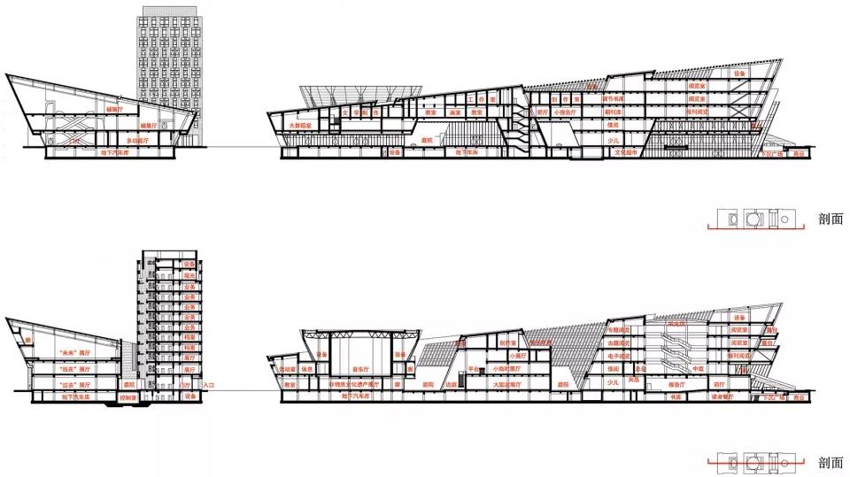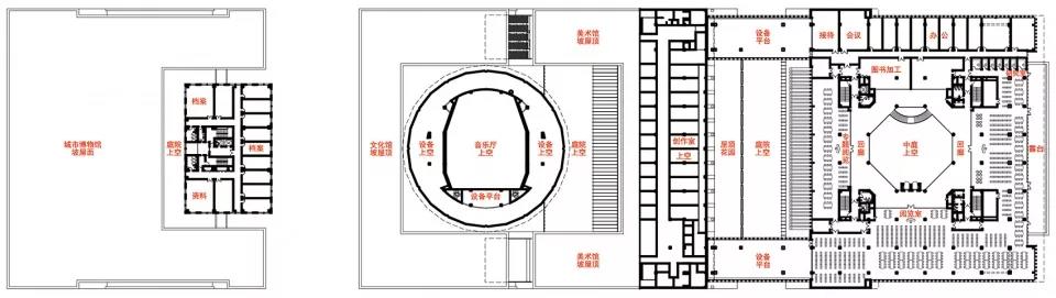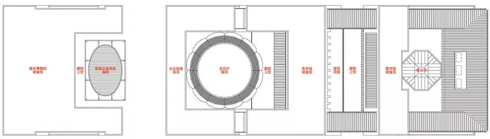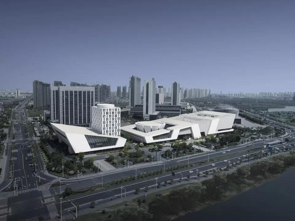 地方象征:“四館”整體造型的靈感源自 “漕運(yùn)之都”淮安最具特點(diǎn)的漕舫,城市博物館靈感來(lái)自厚重的古城樓,音樂(lè)廳的造型由12片“花瓣”組成,象征淮安市花月季綻放。