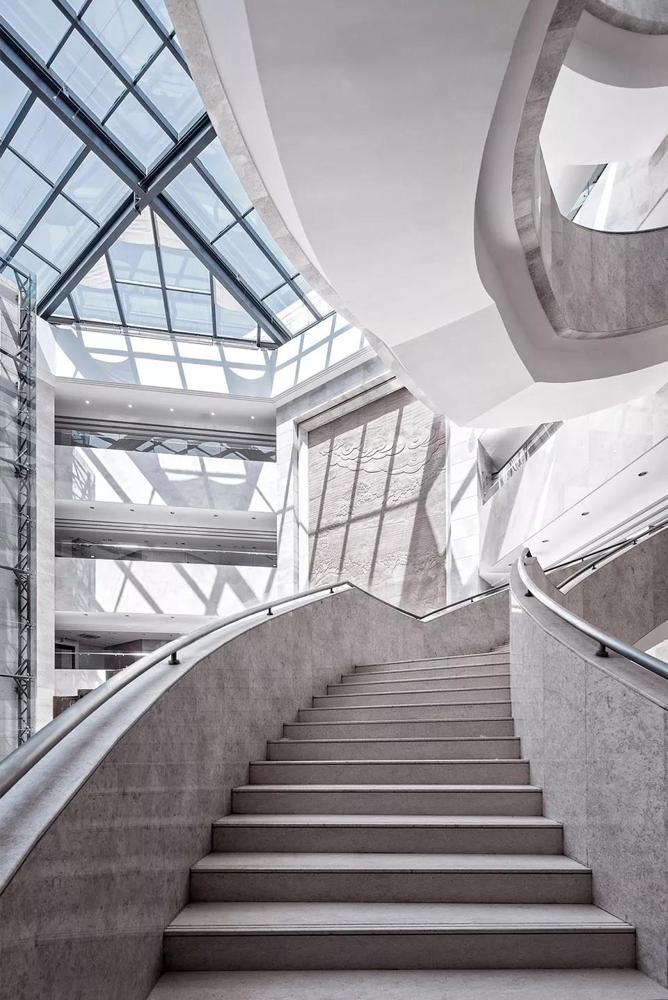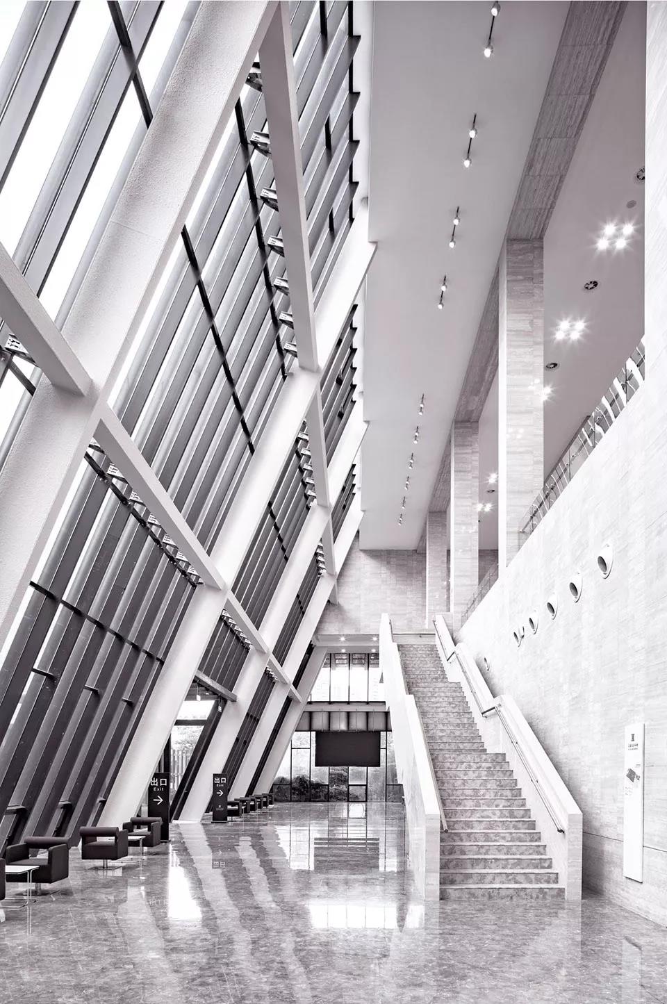 虛實(shí)相生:各館的功能對(duì)自然采光通風(fēng)需求有所不同,如門廳、藝術(shù)沙龍、創(chuàng)作室、閱覽室、音樂(lè)廳、展廳等,外立面則以玻璃幕墻、石材百葉、大面積實(shí)墻等作為對(duì)應(yīng),以求虛實(shí)相生、合而不同。