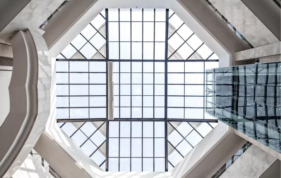 干凈的第五立面:利用斜屋面高于平屋面的那些部分,巧妙的設(shè)計(jì)了出屋面的豎井和機(jī)房,再通過(guò)輕質(zhì)遮陽(yáng)構(gòu)架將出屋面的設(shè)備、管線做了遮擋,確保第五立面的美觀。