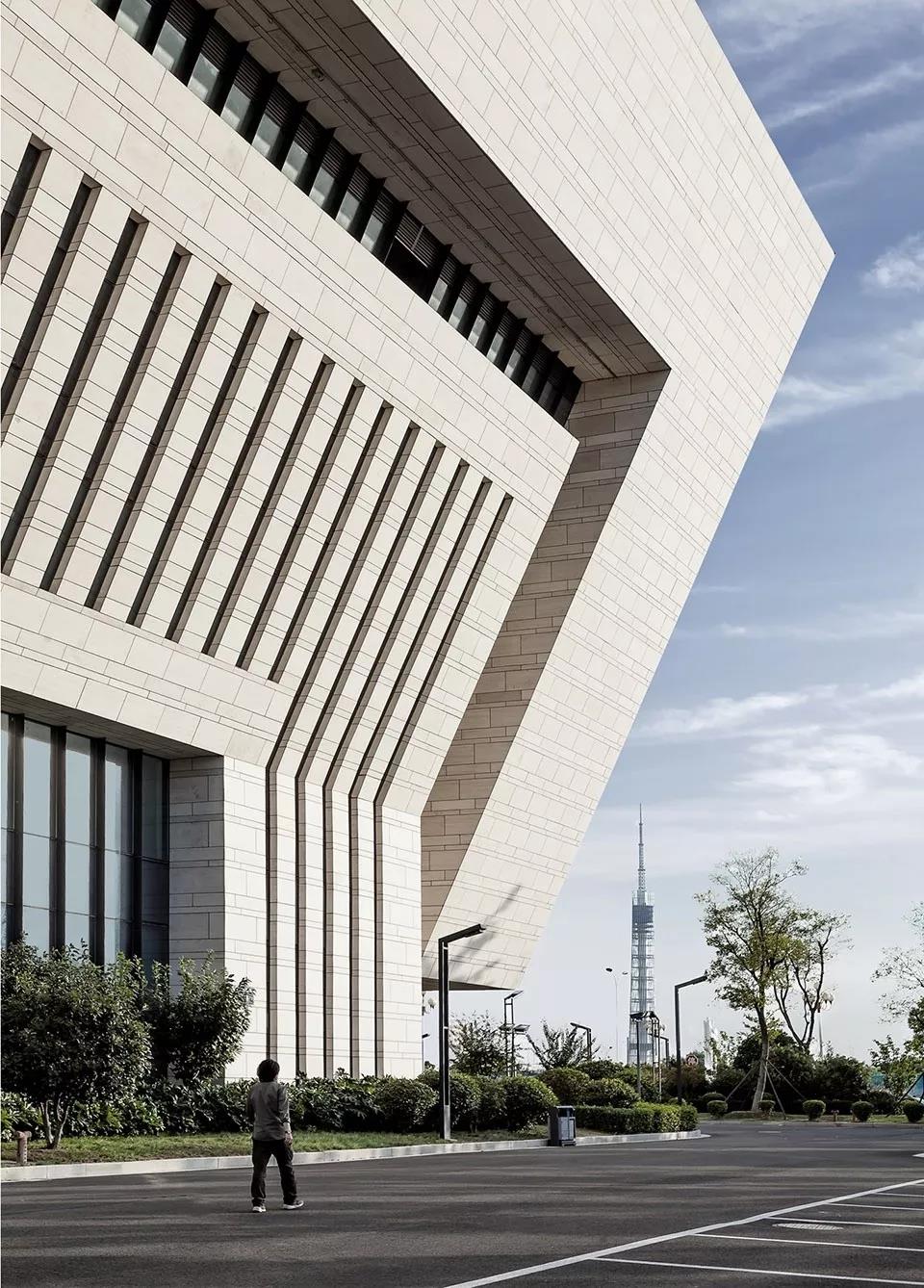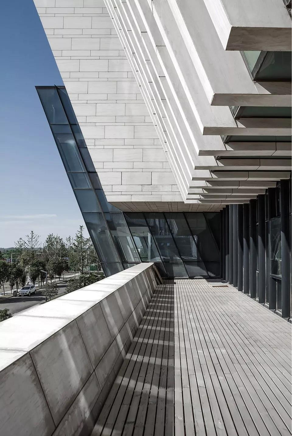 檐下空間:外挑的“石材百葉”底部垂直收至玻璃幕墻,猶如傳統(tǒng)坡頂建筑挑檐底部椽子收頭的效果,使得這個(gè)現(xiàn)代文化建筑的檐下空間有了些許文脈的傳承。
