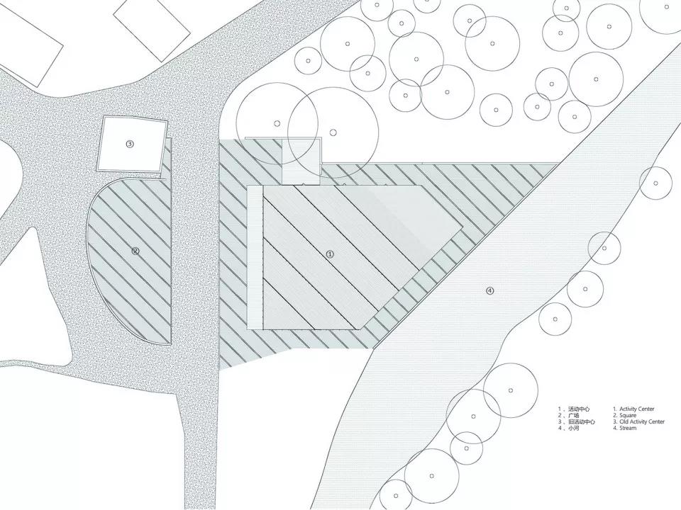 我們把南北地塊作為一個整體考慮,南側、東側設磚砌矮墻,向西北側山體打開,形成場地空間界定。村路東北側磚墻與混凝土鵝卵石鋪地圍合出半月形廣場,考慮為露天電影放映等多功能活動使用。