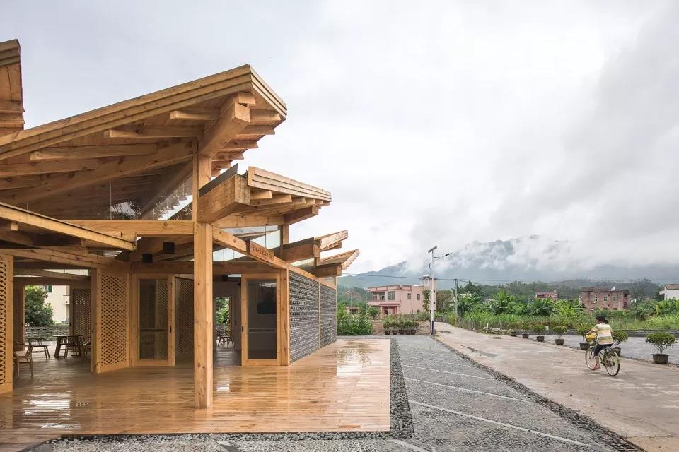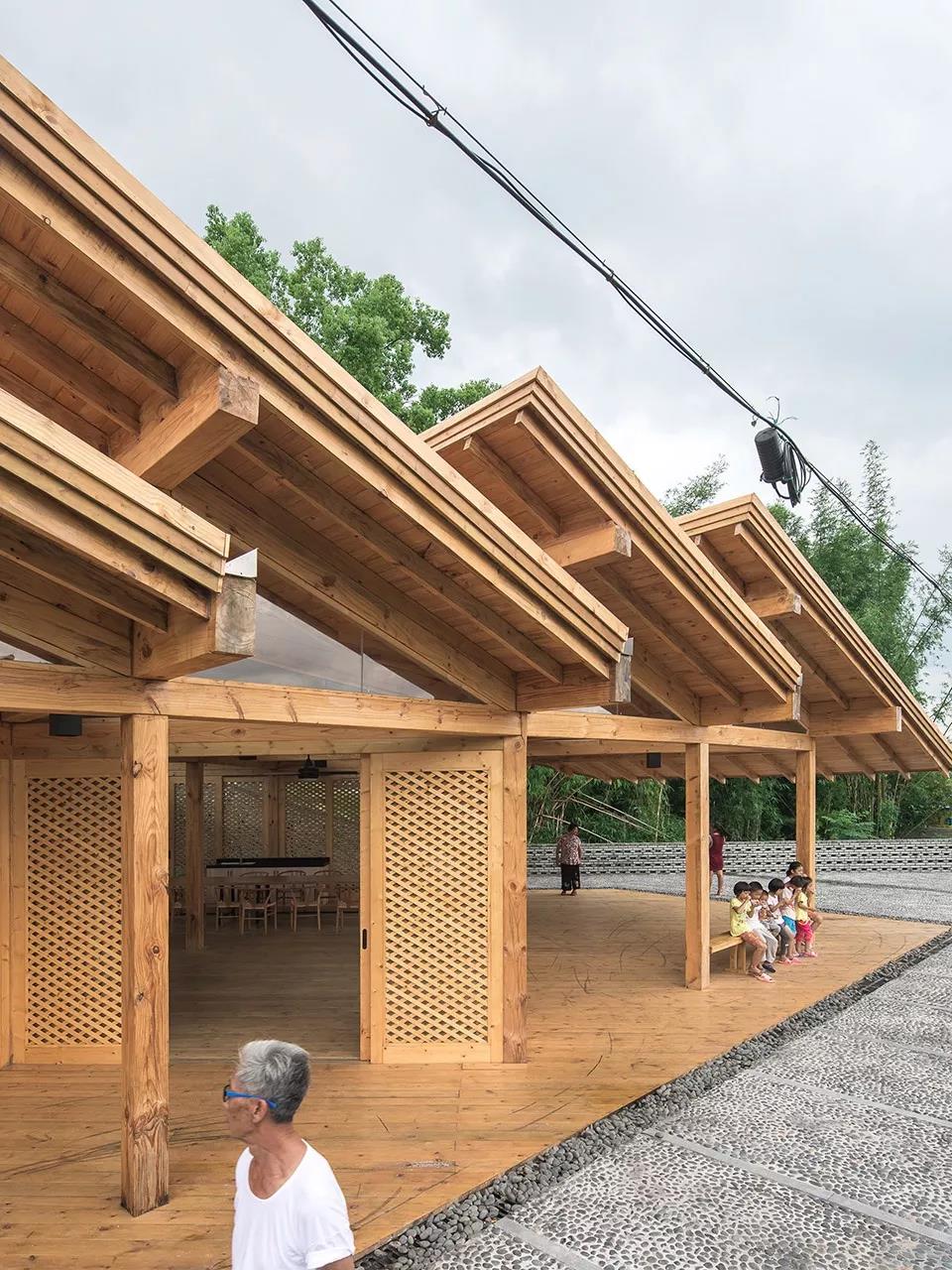 村野山水的基地特質,使我們采用了一種迥異于在城市的建造模式,轉而使用自然的材料邏輯——木、磚為主材,以一種融入“自然”的方式介入對場地的改造,為留守的老人、兒童創造一個溫暖的庇護所。建筑主體為木結構框架體系,選用南方松作為主材,為了減少建造的難度,我們規整梁柱截面尺寸,統一為200MMx200MM,桿件之間為榫卯交接。