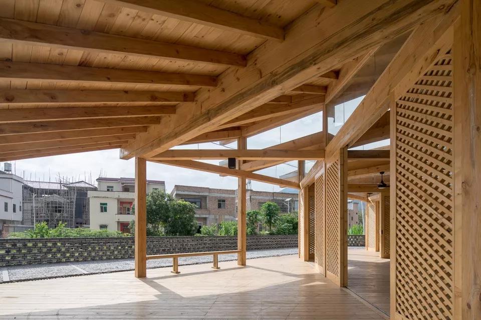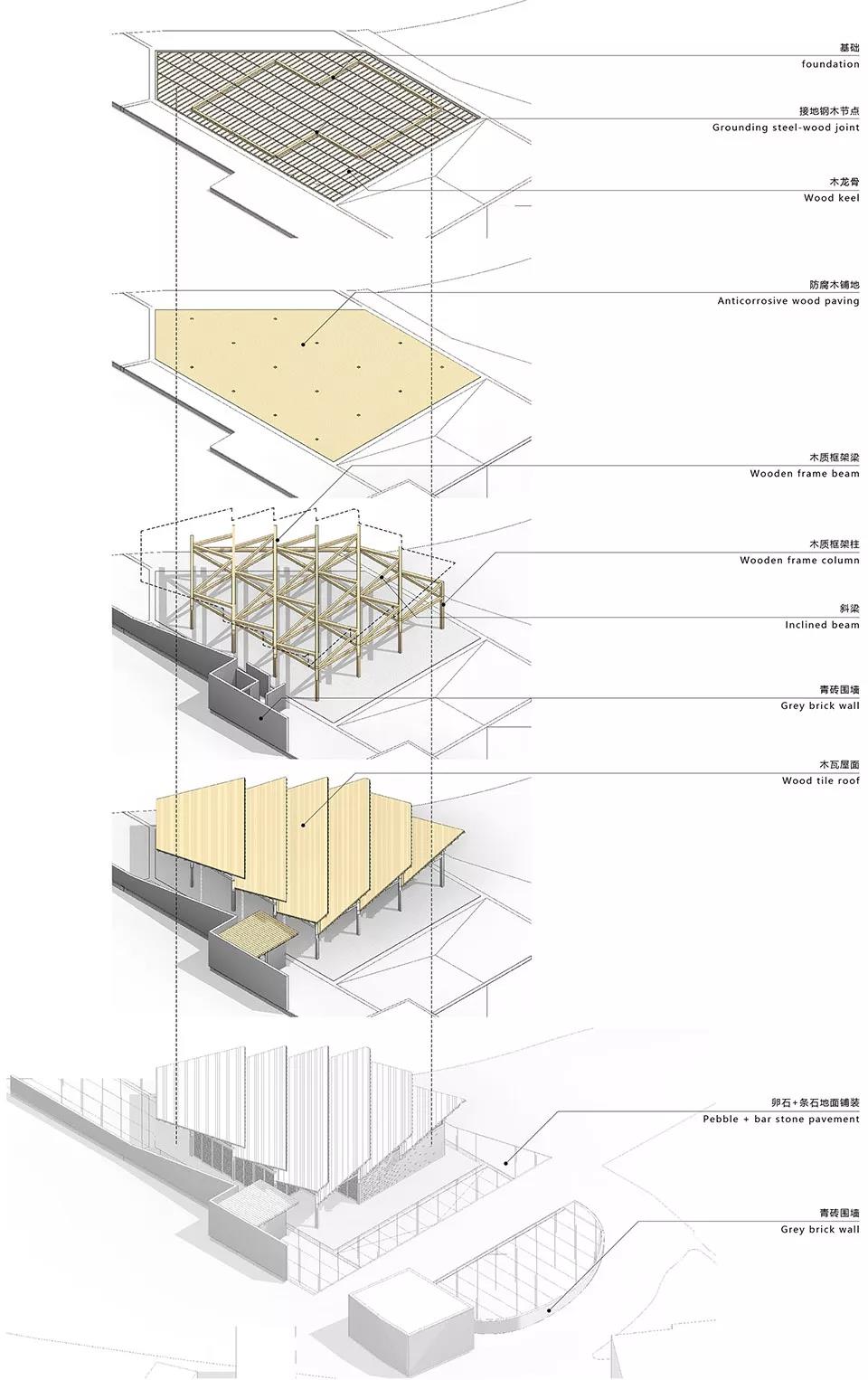 除了面向北側村路一層外墻為有局部凸出的青磚砌體填充墻外,其余均為玻璃木框門扇輔以木條斜紋填充。地面用素混凝土砌筑斜向格構(方向與建筑屋頂天窗方向同),內部填充深色鵝卵石,用水泥粘接。