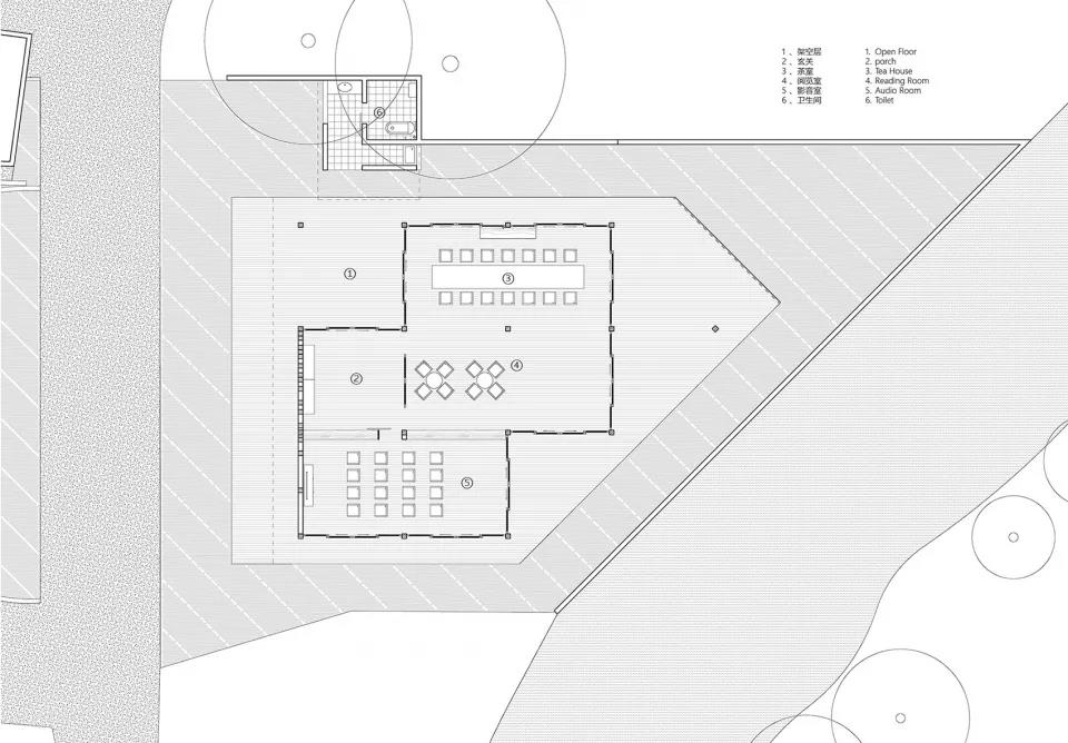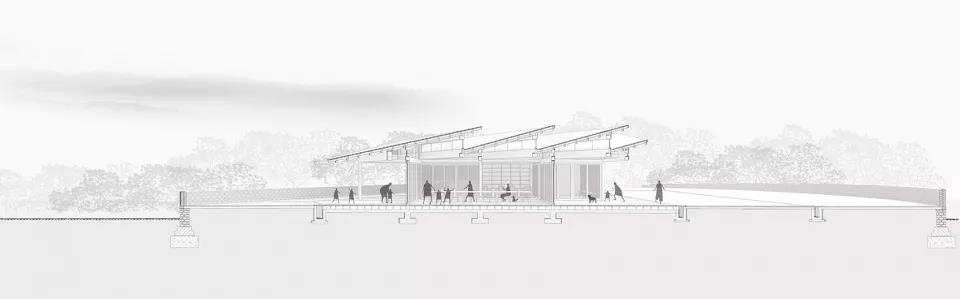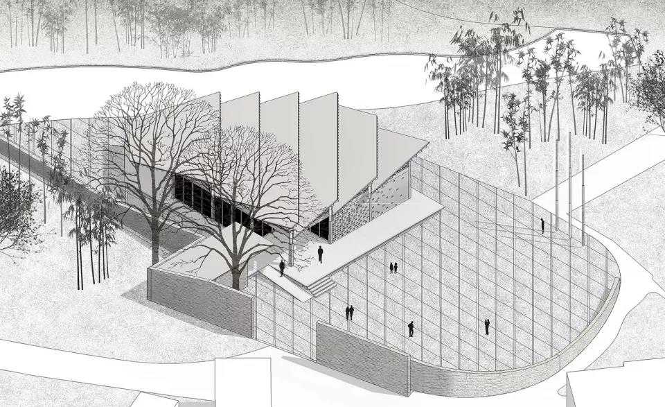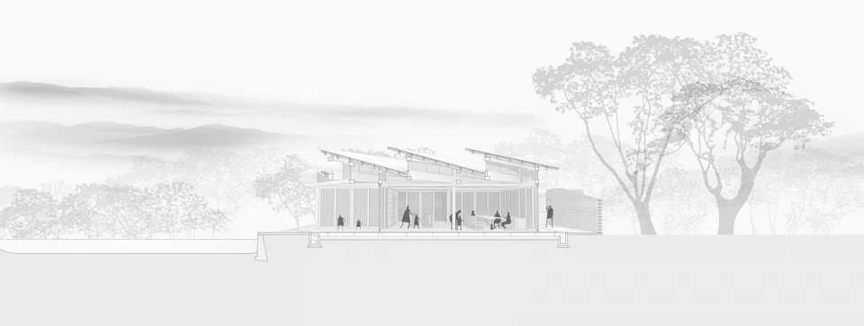 屋面出挑1.5M開敞外廊挑檐空間,形成場地覆蓋。東北側留出一跨架空處理形成主入口;西側、南側留有較大挑檐空間,形成與這兩側室外庭院的空間過渡,南側檐口盡可能壓低與近景的竹子和遠景的山形成框景;東南側檐口空間與矮墻形成狹長圍合,透過鏤空矮墻,原保留的東南側的植物滲透進庭院內部,形成借景。室內空間劃分靈活,適應未來使用需求的不確定性。