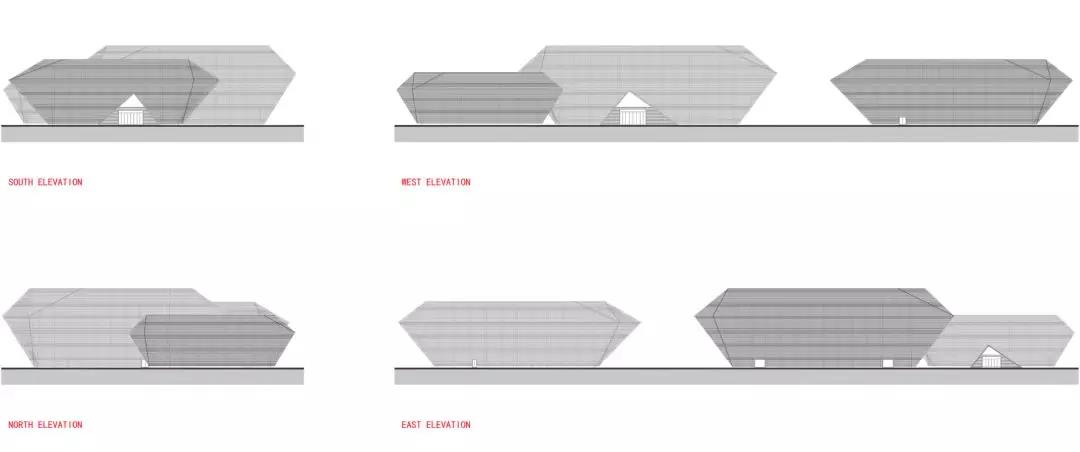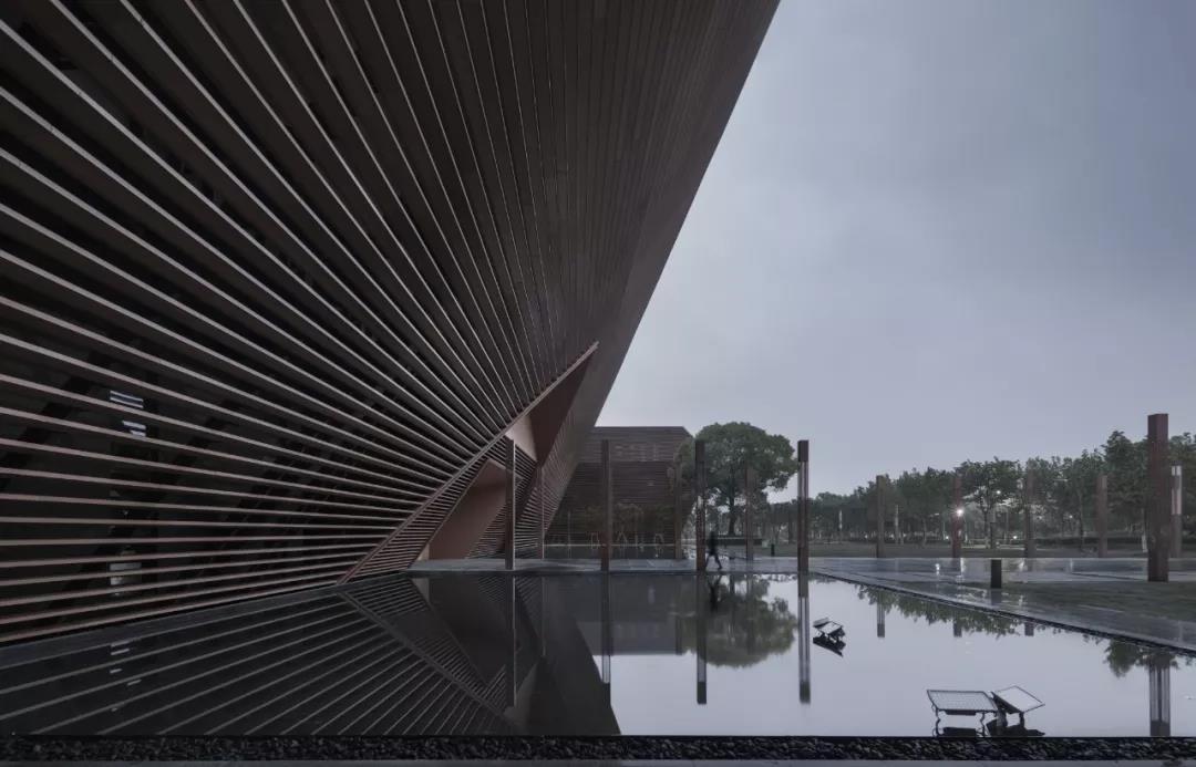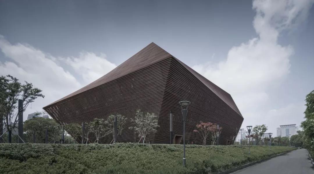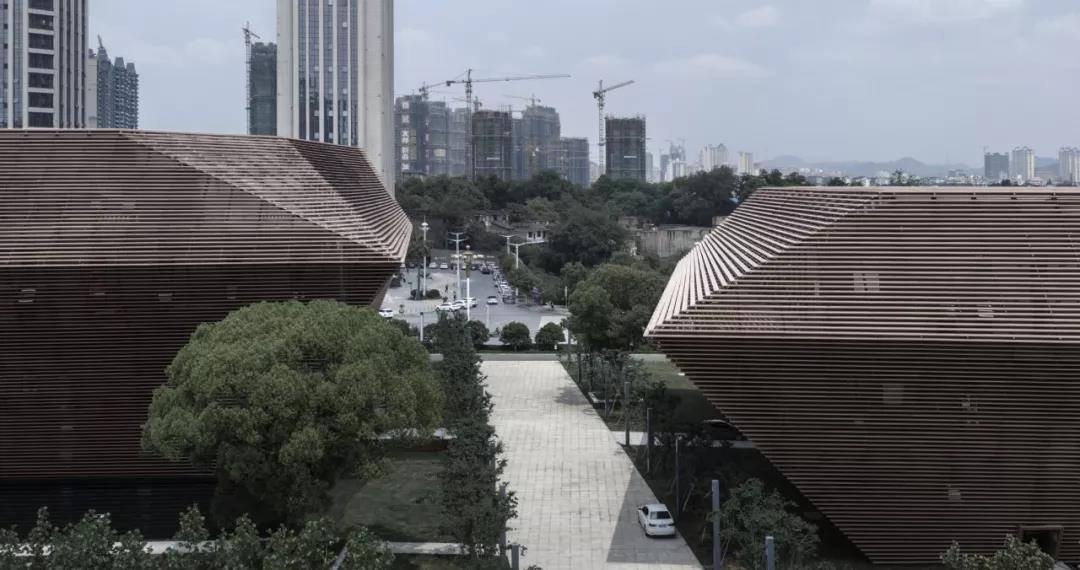從建筑表皮的建構來看,在有限的造價下,三個大小、形狀略有差異的形體外墻均采用了橫向的金屬格柵。金屬格柵采用了接近銅的顏色,暗合上饒本地歷史悠久的采銅工業,金屬格柵間距均勻布置,與門窗洞口的模數一致。