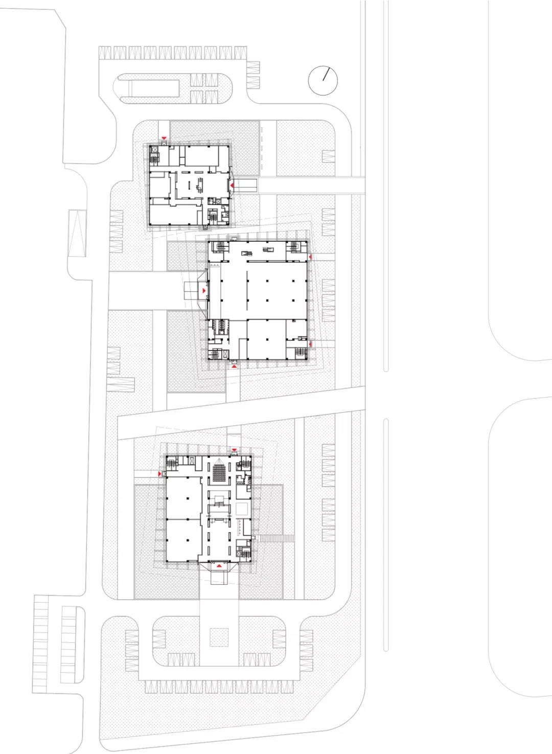 設計首先避免了追求建筑體量的整體式布局,由南至北依次布局城建檔案館、城市規劃展示館、博物館三個建筑體量,根據使用人群、面積、方式,三個體量大小不一、東西錯落布局,在基地兩側的城市廣場與城市道路方向形成若干尺度不同室外空間,根據建筑的使用功能設置了不同的內容和景觀要素,從而明晰了人群進入建筑和游玩的方式。另外這些室外空間形成了城市道路與中心廣場之間的過渡,豐富了城市中心廣場的尺度感和功能性,給恢弘的城市中心廣場賦予了市民的氣息。