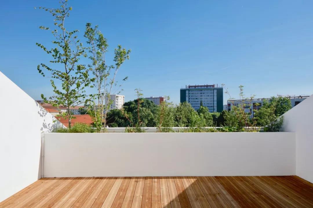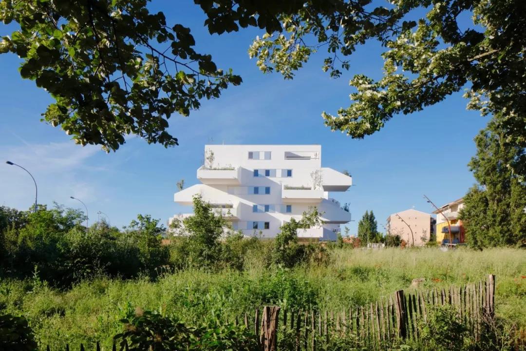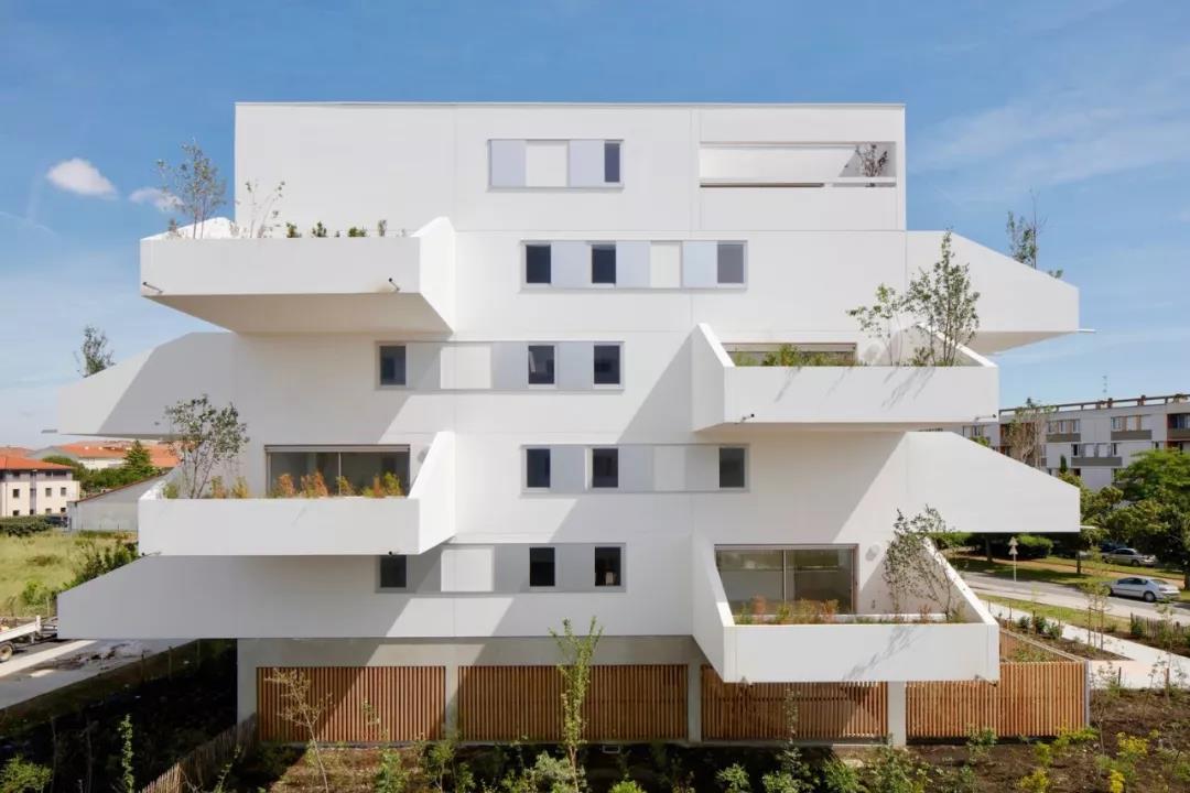 夢想中房屋的樣子總是與擁有一個陽臺、一個花園或是有能看見廣闊天空的視野從而與自然緊密接觸的渴望聯系在一起。帶有植被覆蓋的雙層高陽臺是此住宅的特色,使這個一層層疊加的住宅樓給人一種獨立房屋的感覺,創造了類似“樓中別墅”的樣式。