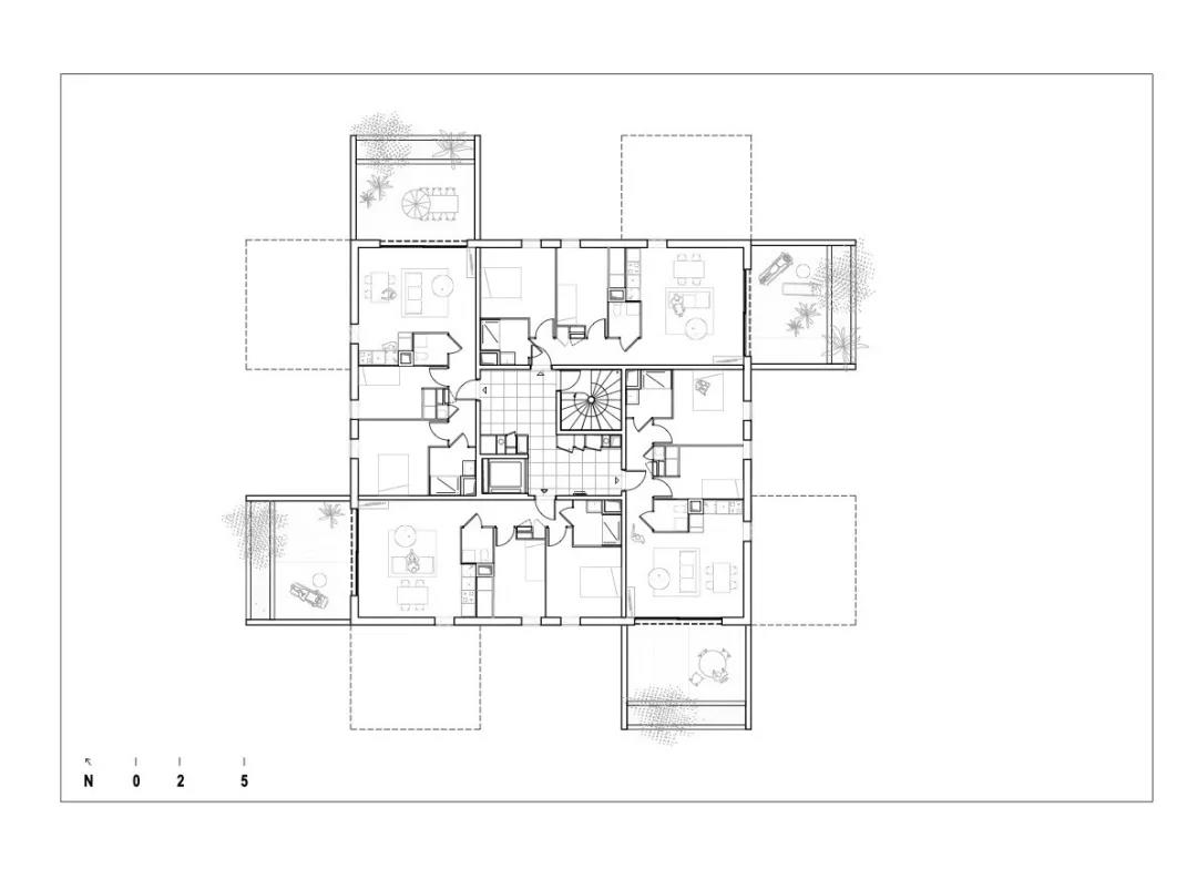 如今,整個項目被大型木質圍欄串聯起來,圍欄內有八棟住宅樓。南面的公共廣場容納了一個露天市場和一排共有產權房屋底層的商鋪。曾經完全內向封閉的基地,如今變得開放而可滲透。在居住區周圍的木質區域增加了這個新社區的認同感,就像一個木質的有人居住的景觀性公共公園。