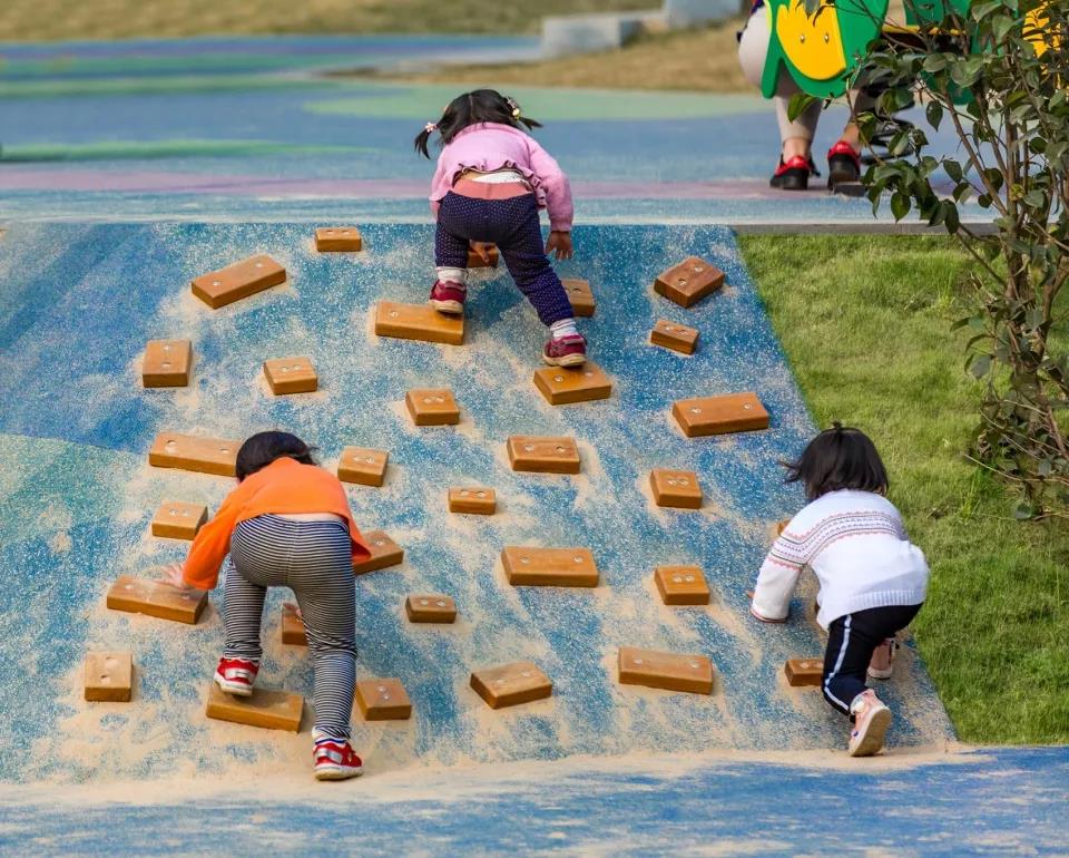 兒童活動區,結合地形設計攀爬空間,場地鋪設透水材料,引流雨水