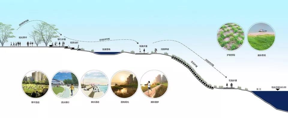 設計高程175-173m,將打造濕地風貌景觀,營造雨水花園,種植濕地植物,利用經過江水沖刷形成的自然灘涂,打造適合市民進行燒烤、露營的親水空間。