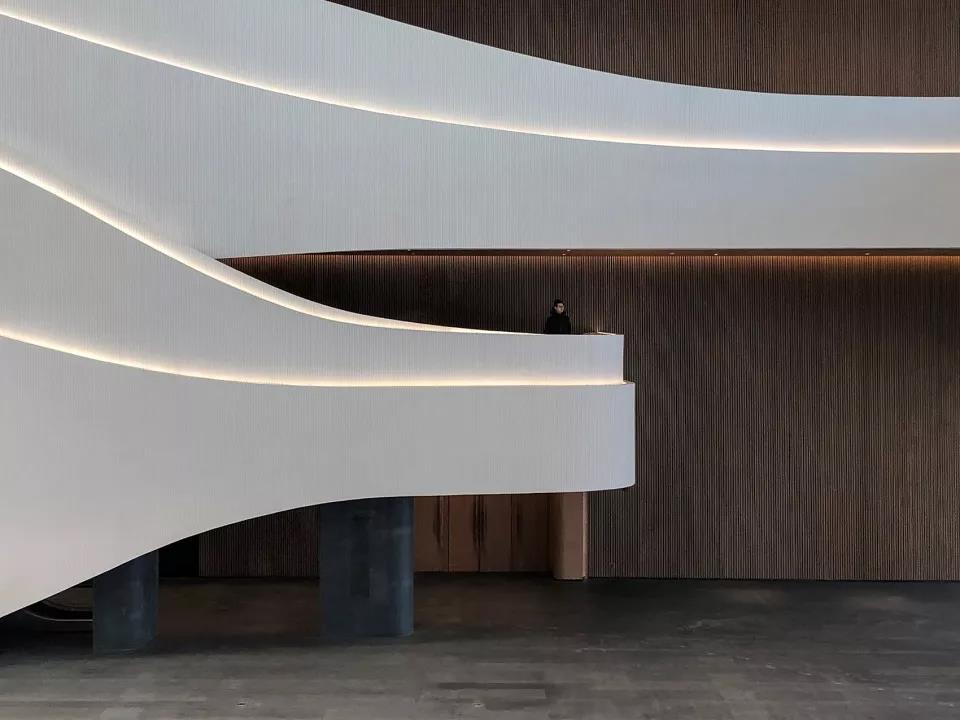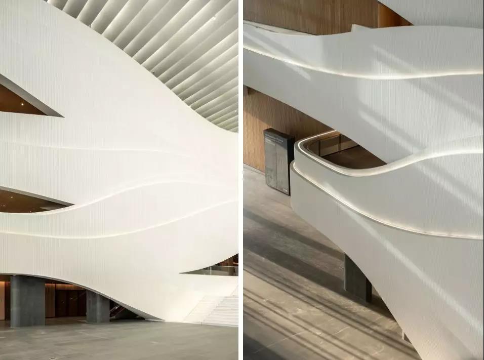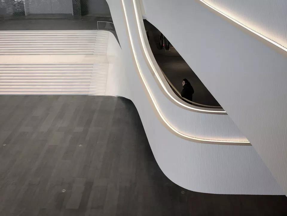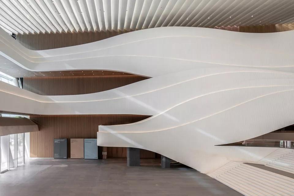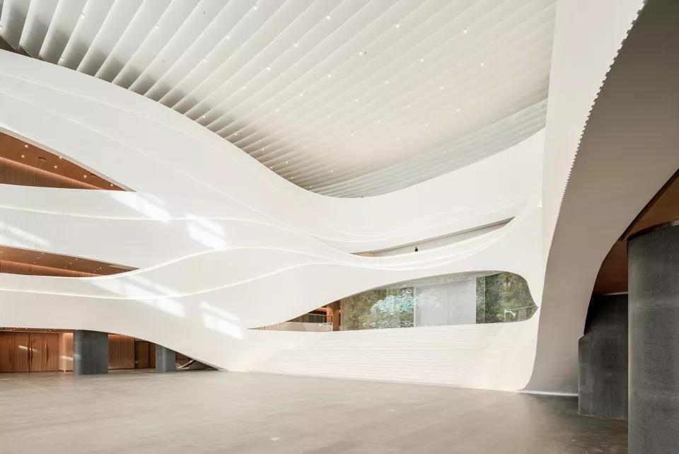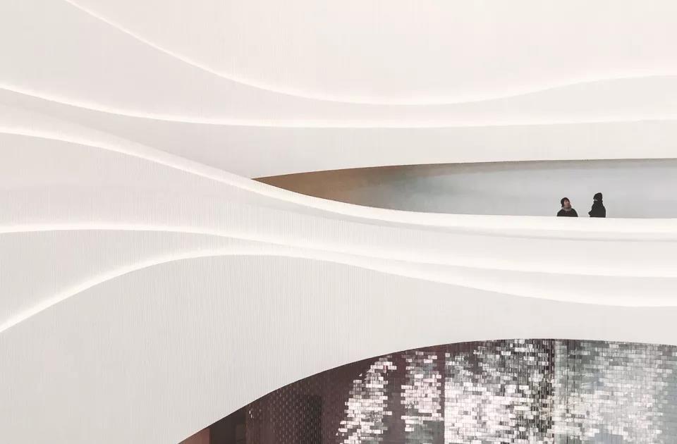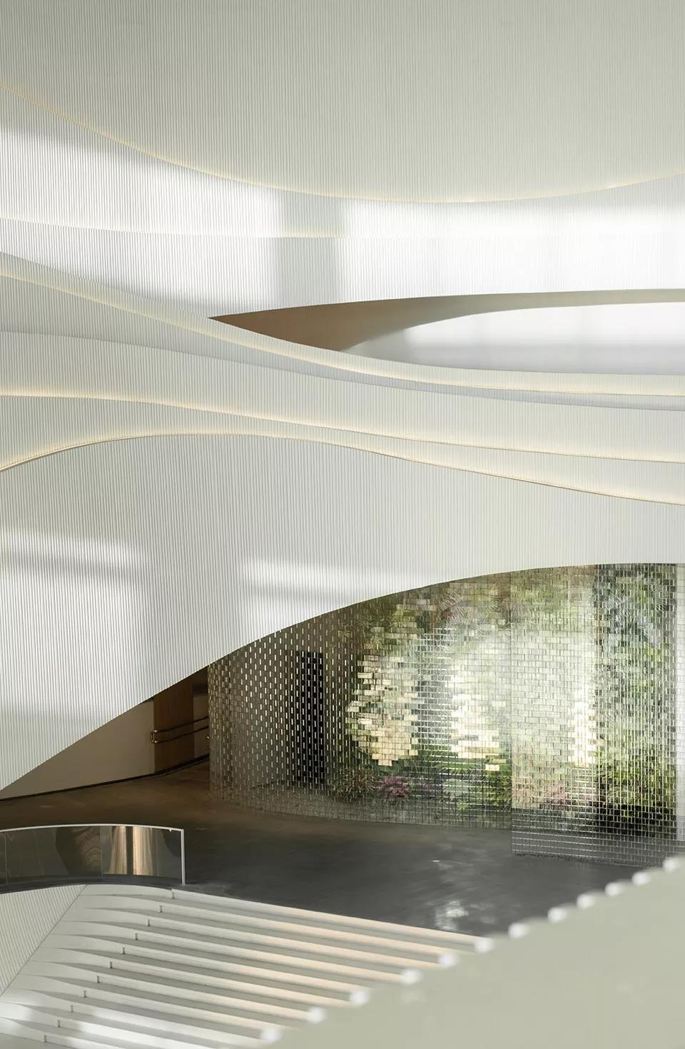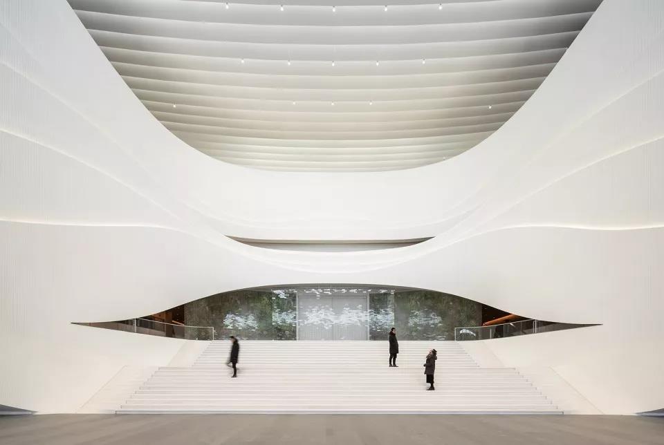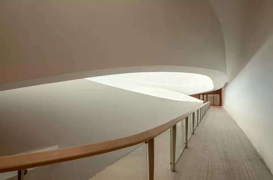 美術(shù)館部分建筑面積約10,000平米,由分布于大廳兩側(cè)的展廳空間組成,我們希望這個美術(shù)館成為城市生活中活躍的場所,盡可能的打破固有建筑平面的局限,為人們提供了一個富有詩意與想象的空間,若干可供休憩與交流的公共空間圍繞著充滿自然光影的中庭重塑了觀展流線,并隱藏于自然流暢的立面中;建筑師在中庭設(shè)計中巧妙的延伸了劇院中看與被看的空間關(guān)系,使表演活動不再局限于舞臺,使之貫穿于整個文化綜合體中,豐富了觀覽體驗(yàn)。