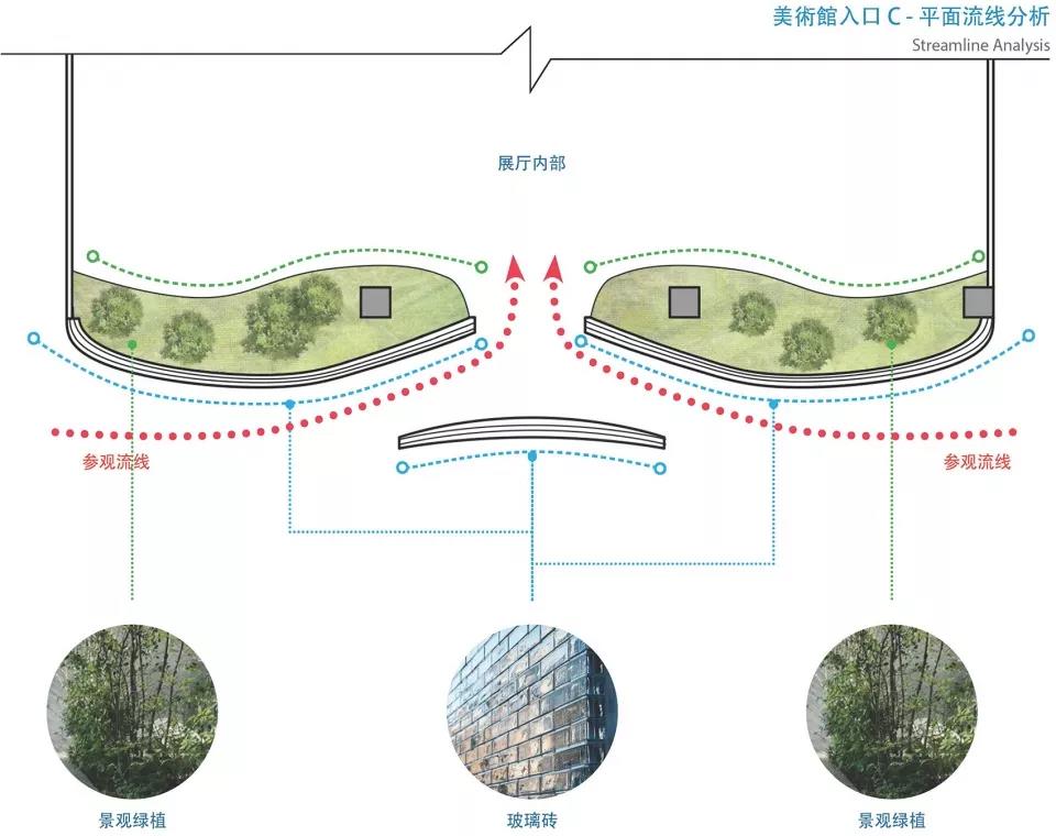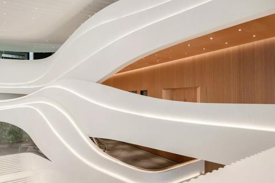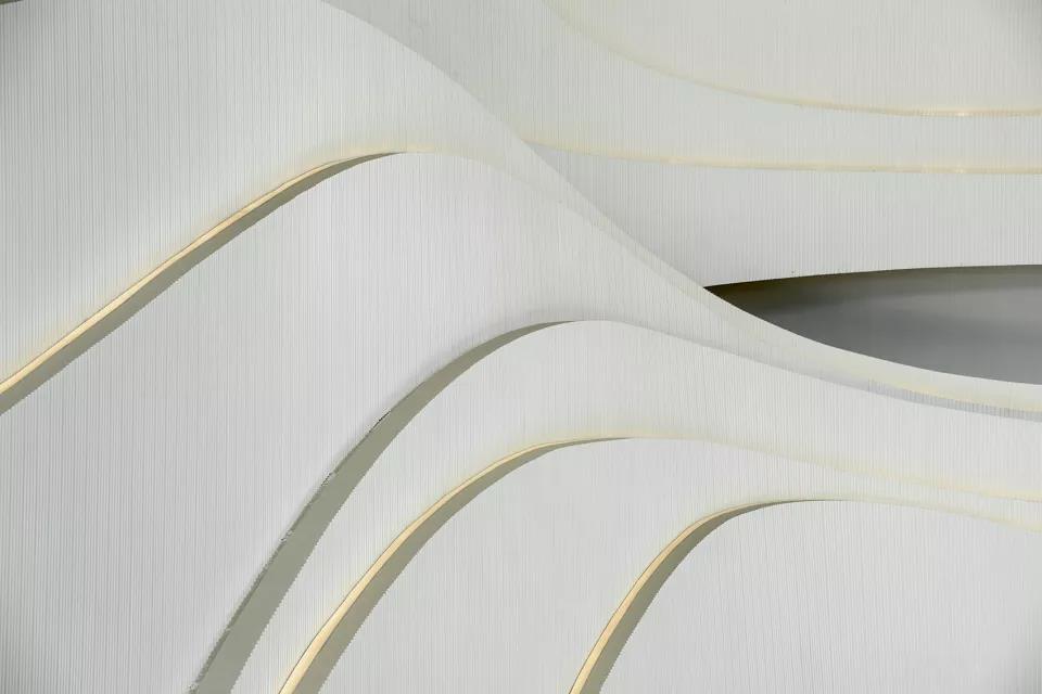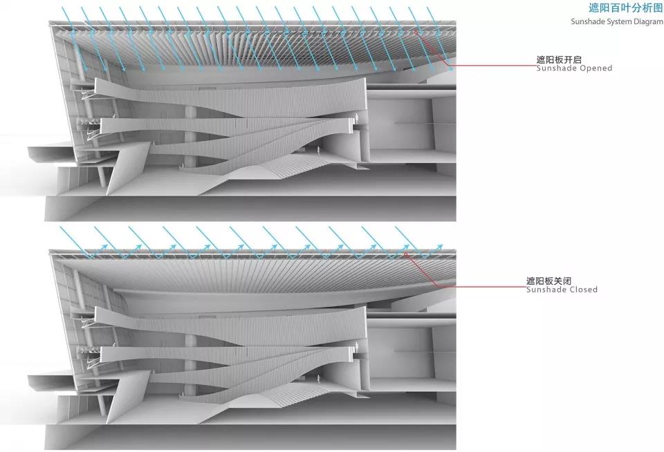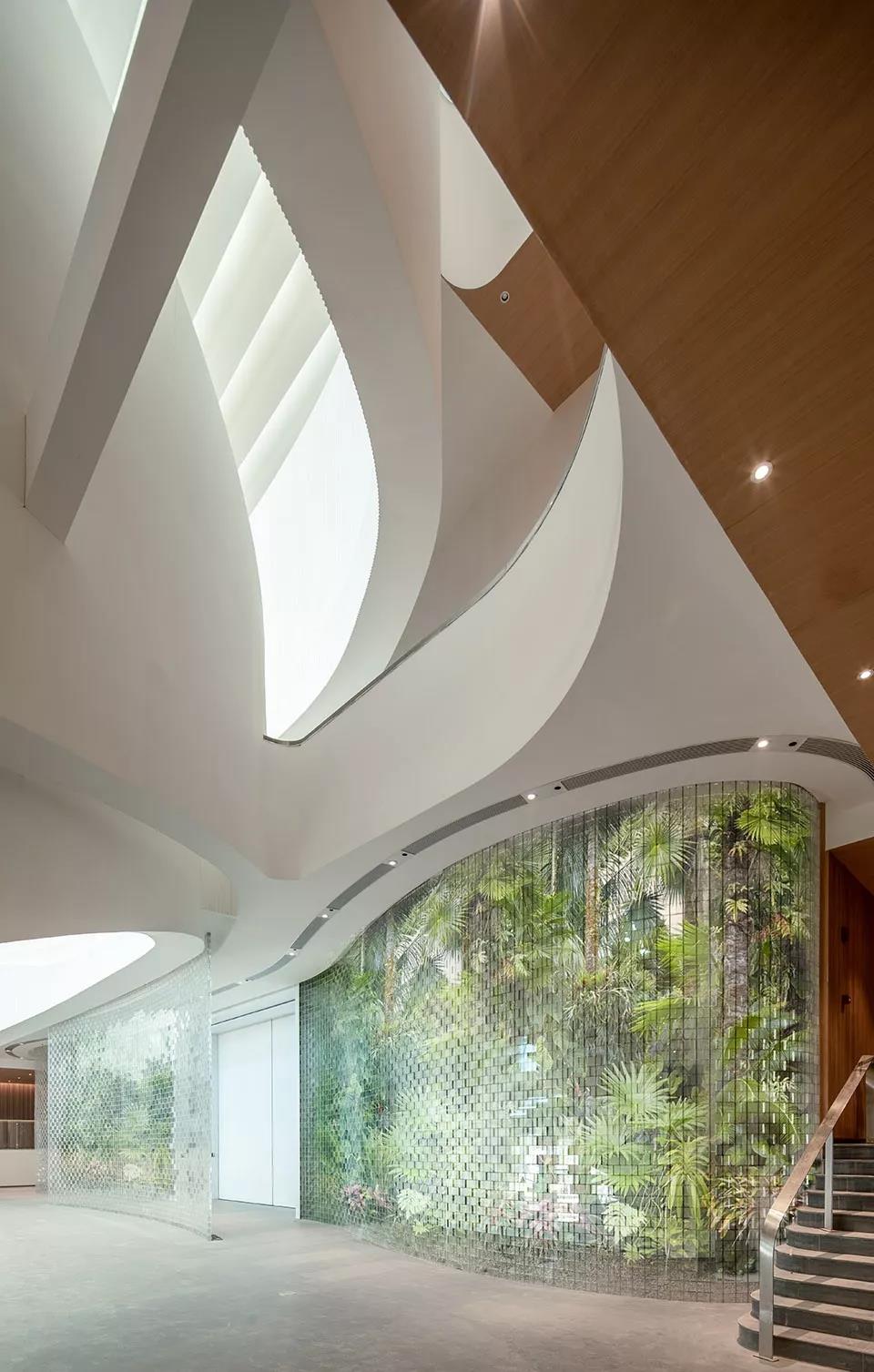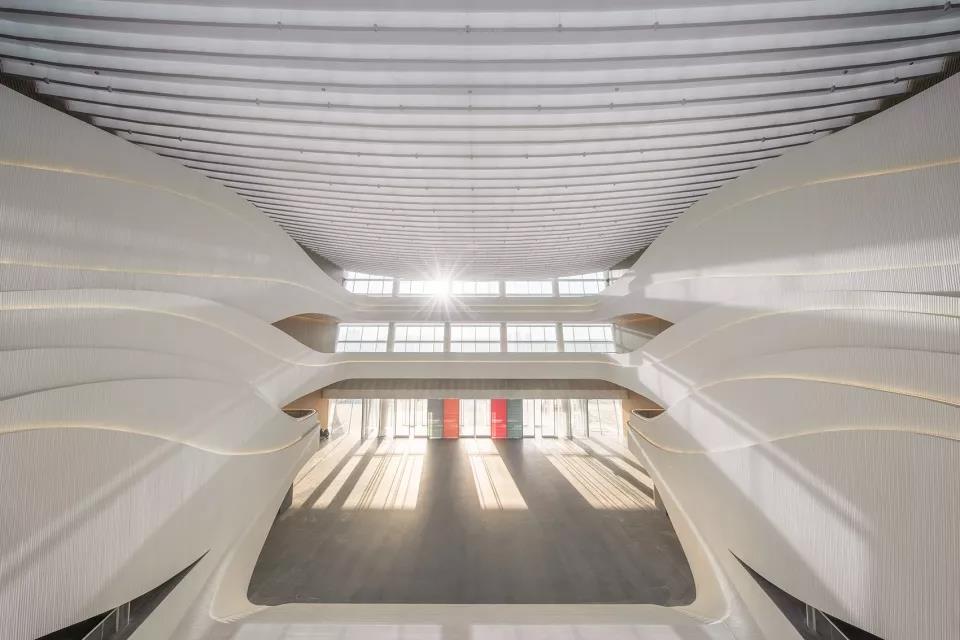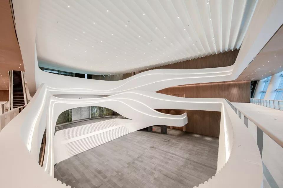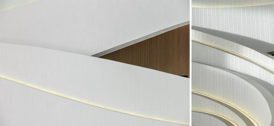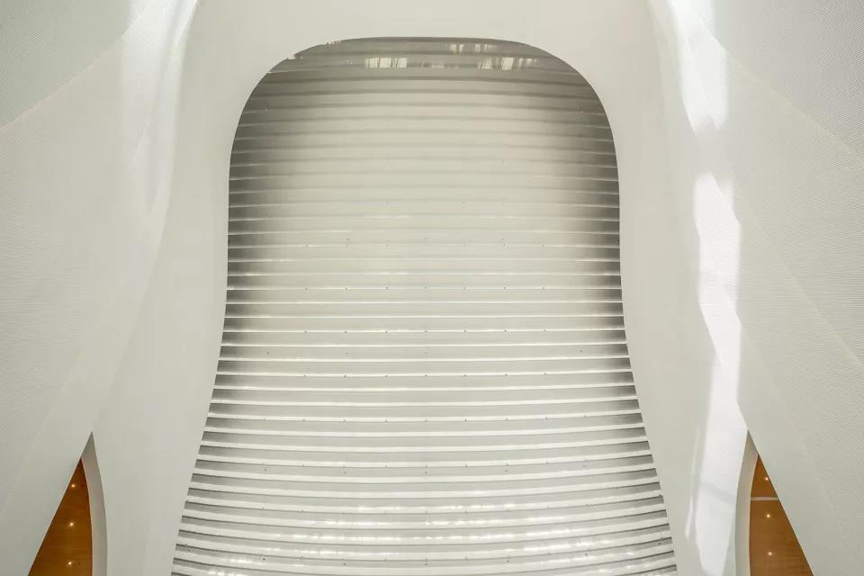 美術(shù)館部分建筑面積約10,000平米,由分布于大廳兩側(cè)的展廳空間組成,我們希望這個美術(shù)館成為城市生活中活躍的場所,盡可能的打破固有建筑平面的局限,為人們提供了一個富有詩意與想象的空間,若干可供休憩與交流的公共空間圍繞著充滿自然光影的中庭重塑了觀展流線,并隱藏于自然流暢的立面中;建筑師在中庭設(shè)計中巧妙的延伸了劇院中看與被看的空間關(guān)系,使表演活動不再局限于舞臺,使之貫穿于整個文化綜合體中,豐富了觀覽體驗(yàn)。
