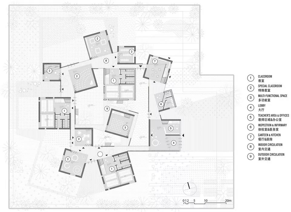 本次設(shè)計的關(guān)鍵點,是對尺度的把控。我們設(shè)計的組團式建筑,用若干“小屋式”結(jié)構(gòu)分解了幼兒園所需的總建筑體量,并以一片多功能的戶外活動場將每棟“小屋”集結(jié)在一起。這種室內(nèi)外密切銜接、高度混合的空間關(guān)系,不僅呼應(yīng)了鄉(xiāng)村的原生肌理,對兒童早期教育而言更是十分重要的場所環(huán)境。