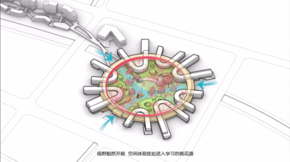 融合共生是我們設(shè)計(jì)太倉校區(qū)時(shí)秉持的核心設(shè)計(jì)理念,也是對德勒茲社會及知識結(jié)構(gòu)發(fā)展理論的應(yīng)用,設(shè)計(jì)中我們以圓環(huán)串聯(lián)起一系列的教學(xué)、科研、產(chǎn)業(yè)、配套等建筑,形成綜合而扁平化空間組合,旨在創(chuàng)造一座桃源中的校園。圓環(huán)界定了內(nèi)外空間關(guān)系,外部空間是面向城市的,內(nèi)部空間則是創(chuàng)造了一個(gè)桃花源的世界,形成內(nèi)外的對比。