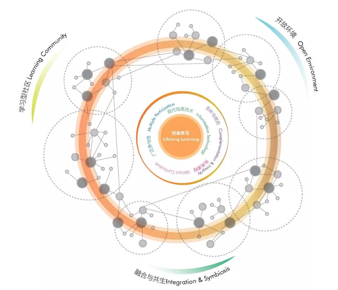 整個(gè)學(xué)校采用開放性、個(gè)性化、多元化式空間營造,在校園空間中極力塑造應(yīng)對教育訴求的復(fù)合型空間。圓環(huán)和環(huán)內(nèi)圈的低層部分主要作為以學(xué)習(xí)超市為主體的融合式教育和創(chuàng)新平臺,其余的U形體量主要為行業(yè)學(xué)院,連同校園公共設(shè)施和生活區(qū),共同形成未來大學(xué)的總體構(gòu)架。