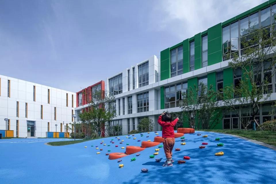 片區里所有的居住建筑,主要體現兩種色調:灰白和土黃。建筑師覺得這不應該是美麗的湖邊的色彩,于是希望給這個湖邊的環境加入一抹亮色,給這個社區增加更多的生氣,讓居民從周邊高樓上看下來,能立刻找到這個以幼兒園為“注點”的濱湖空間,而不至于迷失在灰白和土黃的鋼筋水泥的“森林“里。