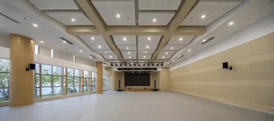 西側的大操場,是整個幼兒園的主空間,它被多功能音體教室、連廊和單元教室三面環抱。三個面上的部分墻面,被設計成弧形曲面,增強了大操場被環抱的感覺。三個弧面依然強調了色彩在這個建筑中的主題位置,像是三個彩色的大禮盒,環繞著操場上跑跳嬉戲的孩子們。