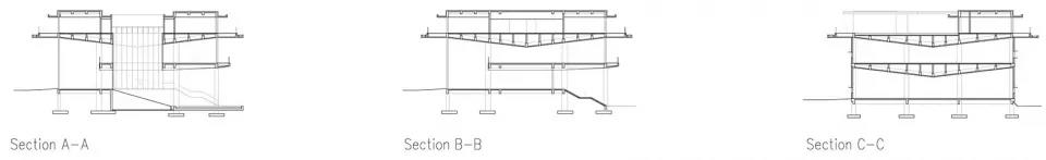 館所的斷面中,無梁混凝土樓板從中部朝兩側懸挑而出,好擬一把張開的傘。這把“傘”從檐口到中心處逐漸由薄變厚,并在最厚的區域承擔藏匿暖通管道的需要。