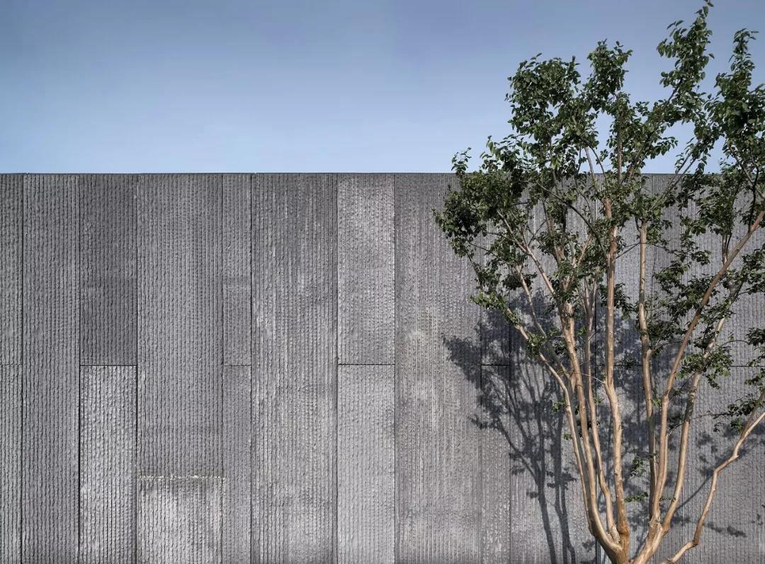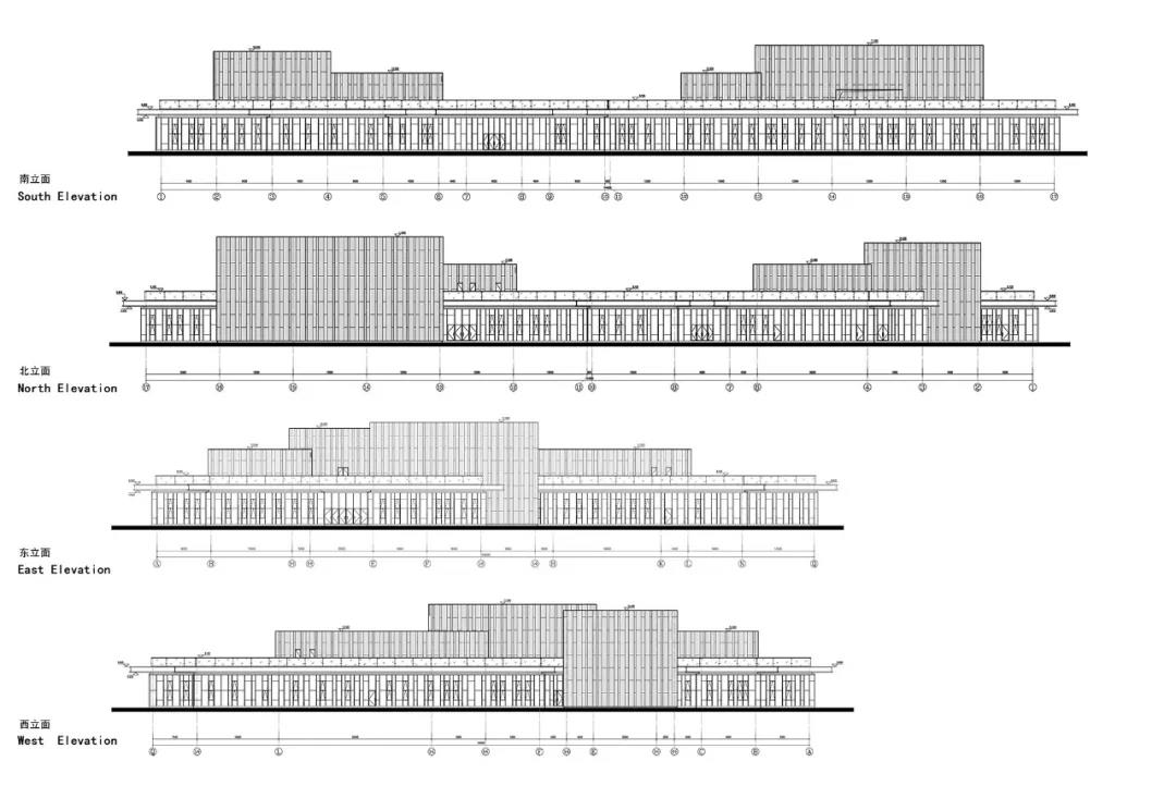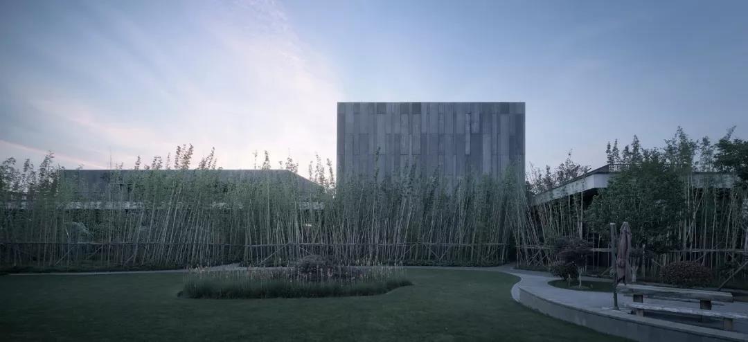 一層主要立以玻璃幕墻為主,不同明度綠色玻璃又韻律的組合,再加上幕墻立梃猶如“竹林”意向的襯托。整個立面作為維護(hù)結(jié)構(gòu)被虛化。幾個凸出體量的立面肌理也延續(xù)“竹子”的豎向分割,渾然一體。純粹和完整的立面也是各建筑設(shè)備精心布局的結(jié)果:各設(shè)備管井和出口都統(tǒng)一整合在屋頂設(shè)計。
