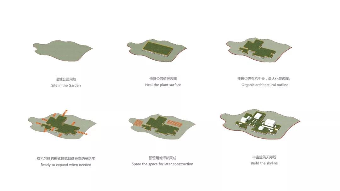 建筑主要功能集中一層布置(層高7.0m),最大化減少對公園的壓迫感。同時,一層屋頂花園又是被抬高的公園“植被”,既修復(fù)了生態(tài)公園的綠化界面。又是視野極佳的“觀景臺”,提供了優(yōu)美的活動場地。局部凸出的建筑體量(陳列館、展示廳、多功能廳等)退在屋頂花園后,猶如幾個“雕塑”,強(qiáng)調(diào)建筑的“分量”感,也增加了整個建筑的空間層次。