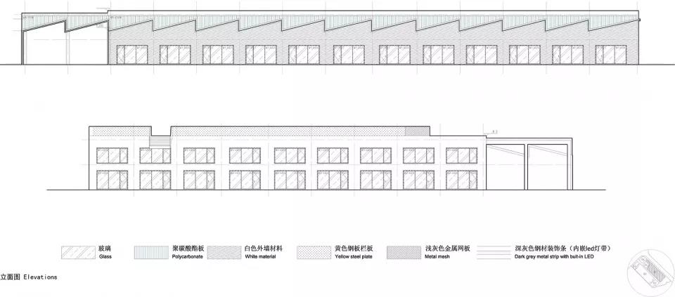 ▼在建筑沿街面,設計將原有藍色彩鋼板鋸齒的工廠形態加以優化,形成回應燈芯絨記憶的立面肌理并將單層空間變成loft空間