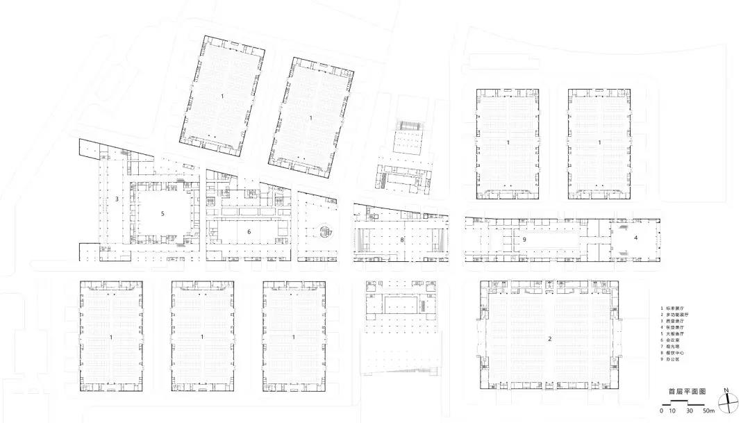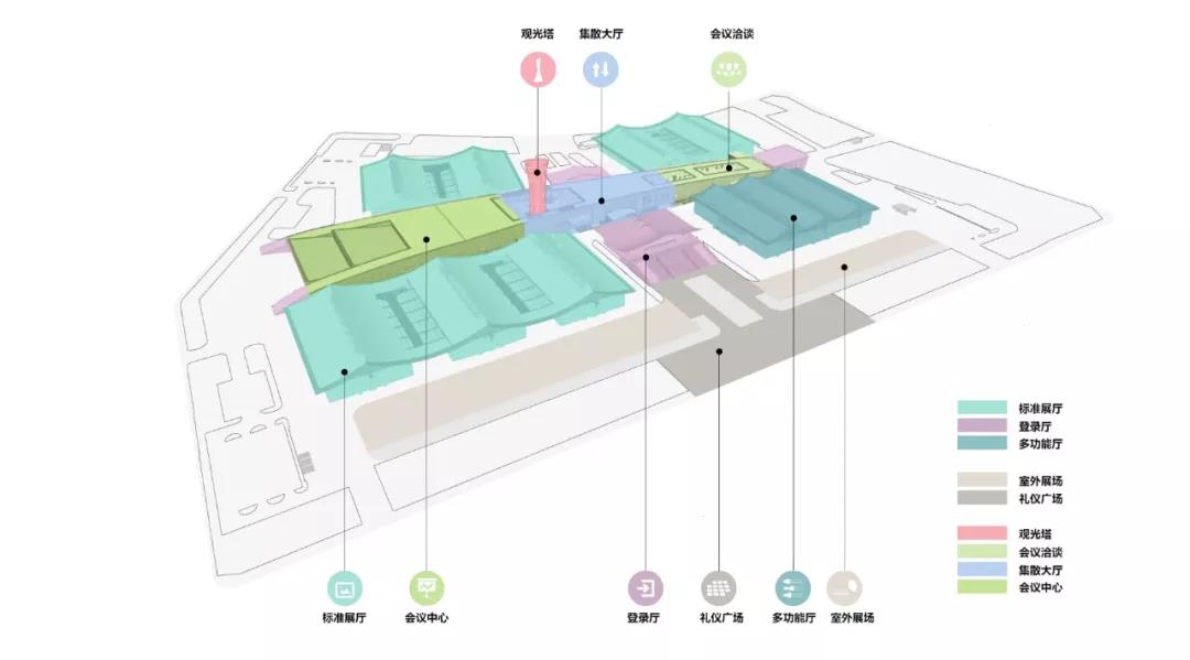 2、靈活高效的功能組合。建筑設置多標高平臺系統(tǒng),供貨線路與人行流線互不交叉。展廳沿樞紐區(qū)魚骨式生長,兩三成組。既能保持整體運營的連貫性,又相對成組團獨立對外經(jīng)營。設置一個相對獨立的2.6萬m2多功能展廳,承擔包括展覽、會議、演藝、賽事等功能。大觀演廳采用無固定坐席布置,后排設置少量活動座椅,可根據(jù)需要分隔成2-4個小廳。約3000m2大宴會廳也可以分隔為3個小廳獨立運營。