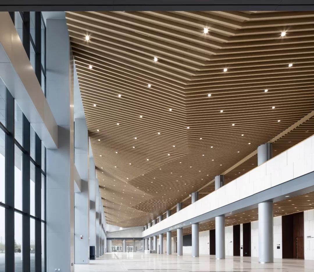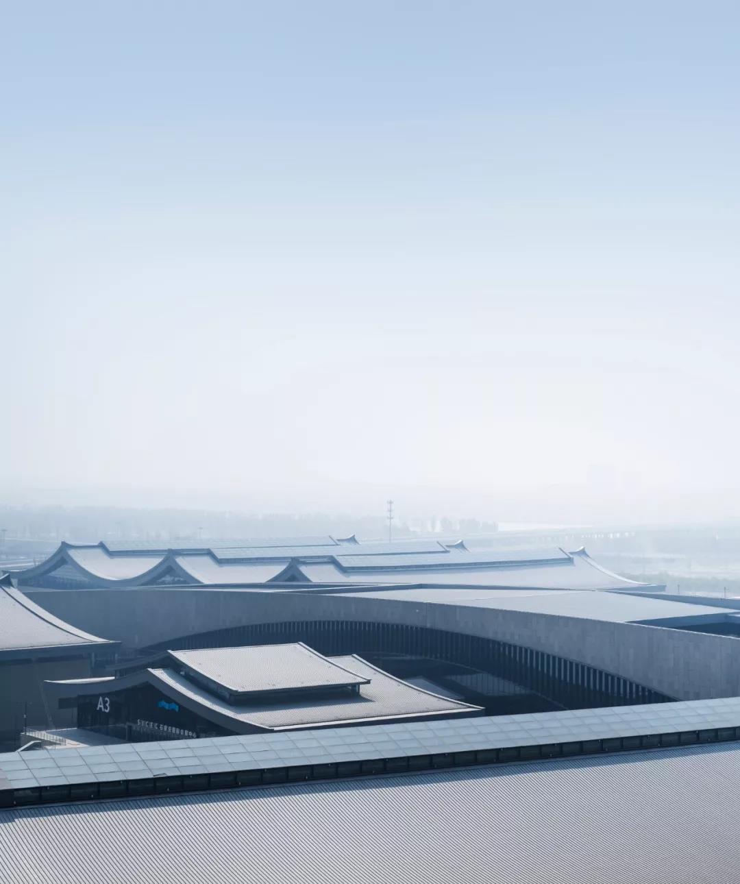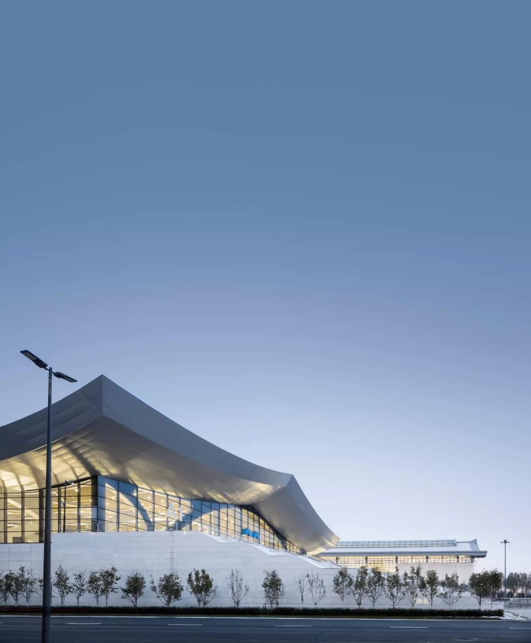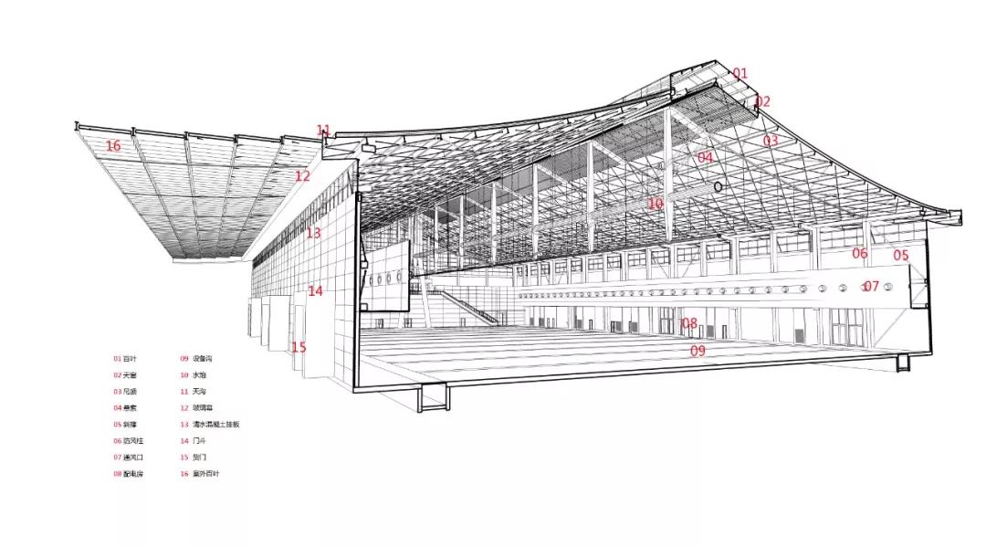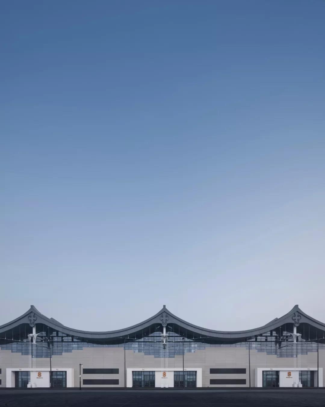 4、由懸索結構自然形成的大屋面形成對傳統(tǒng)建筑的強烈映射,同時在展廳山墻面細部抽取借鑒正定縣隆興寺摩尼殿歇山抱廈意象,用新材料新技術呈現(xiàn)幾何力學和建筑美學的統(tǒng)一,也進一步提升了參觀者對建筑在地性的認同度。