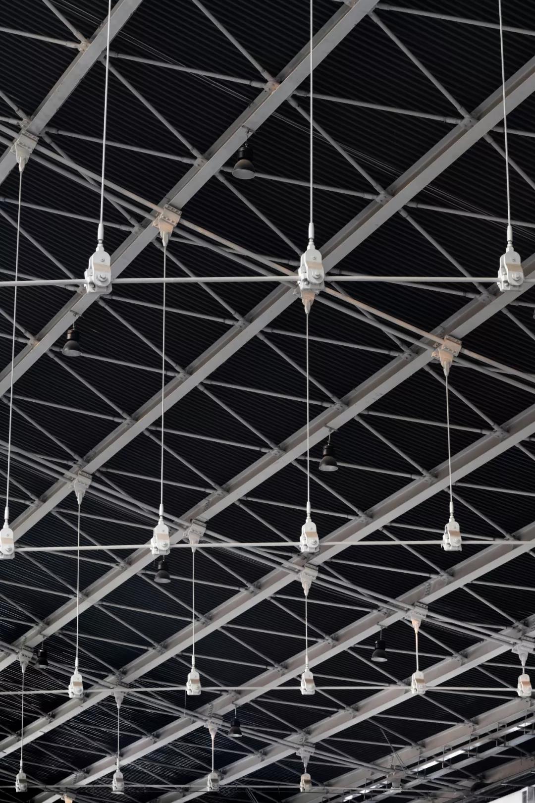 3、結合會展建筑大跨度空間的需要,應用懸索結構實現(xiàn)功能要求同時實現(xiàn)富有韻律感的連續(xù)屋面。石家莊國際會展中心的7個標準展廳全部采用全球罕見雙向懸索結構,較桁架結構約節(jié)約一半用鋼量。懸索結構展廳屋面連綿起伏錯落有致,展廳大跨度屋蓋,主承重結構最大跨度105米,次承重結構最大跨度108米。