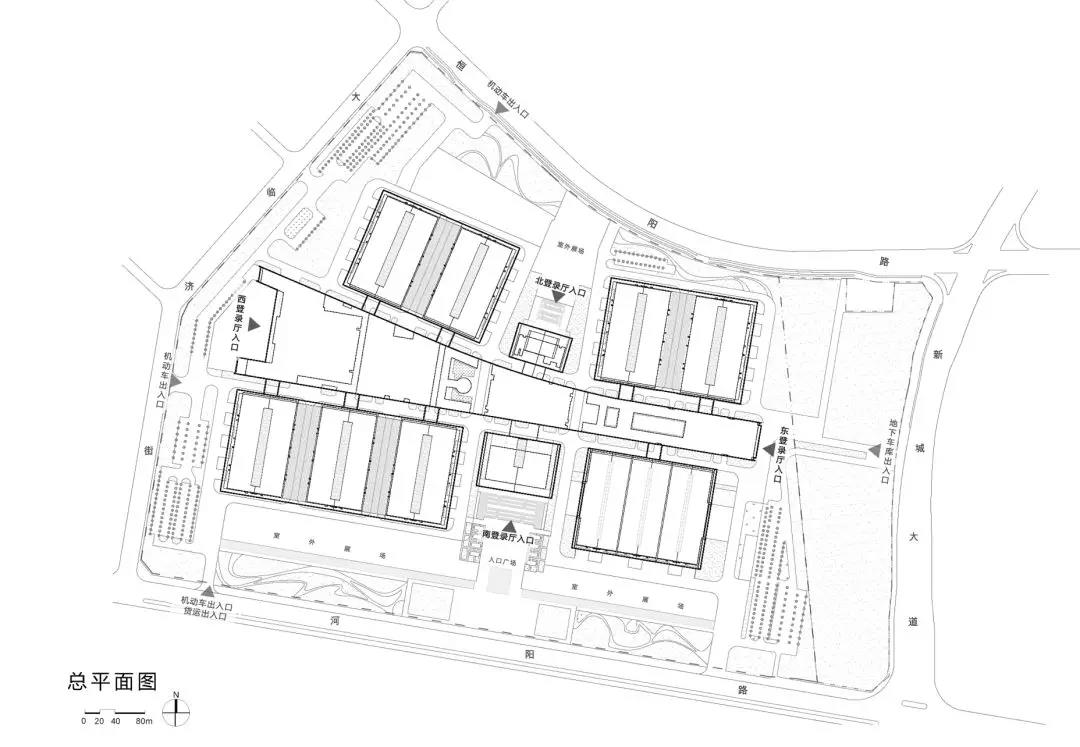1、圍繞會展建筑的開放城市空間。場地不設圍墻市民可以自由出入,靠近城市干道界面多設置近人尺度景觀小品,鼓勵與外部互動與交往。同時將原規(guī)劃貫穿東側綠地的地面車道改為地下車道,將北側園博園到南側滹沱河公共綠地休閑步行通道連為一體,為市民創(chuàng)造豐富、連續(xù)、宜人的公共開放空間。