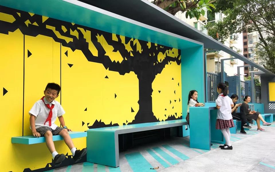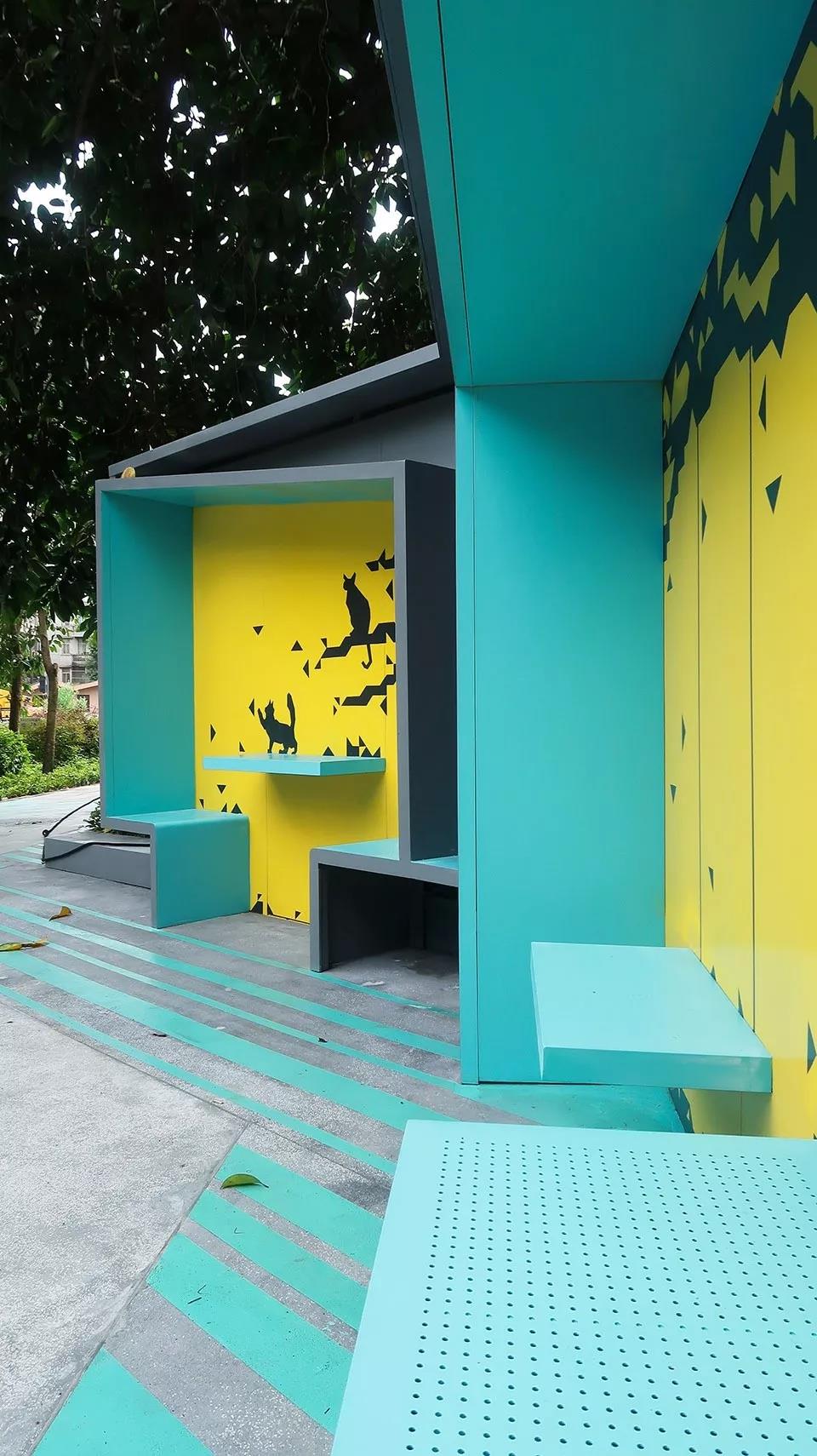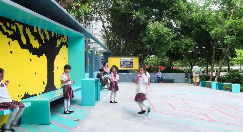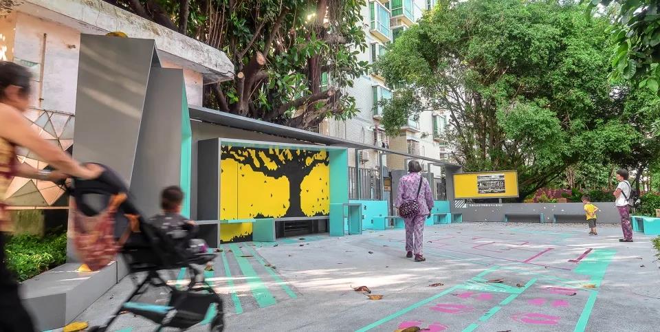 我們希望社區居民與場地產生互動,而不僅僅是匆匆而過的社區出入口廣場,設計通過劃分交通與停留的區域,在流動的空間內創造“定格的風景”,流動中的人群與被定格的風景,共同構成場地獨特的記憶點,利用現狀小區圍墻植入一條連續的折廊整合空間,把稍縱即逝的風景定格在墻框內,而往來人群成為了動態的風景,被吸引,或停留,或行走,或閑座,或交談,與背景墻框形成動態與靜態交融的連續畫面,也成為了城市界面的一抹色彩,從而改變場地原本功能單純一且封閉的角落空間,成為供鄰里聊天、閑坐等候、兒童片刻玩耍,來往人群休息的公共開放空間。