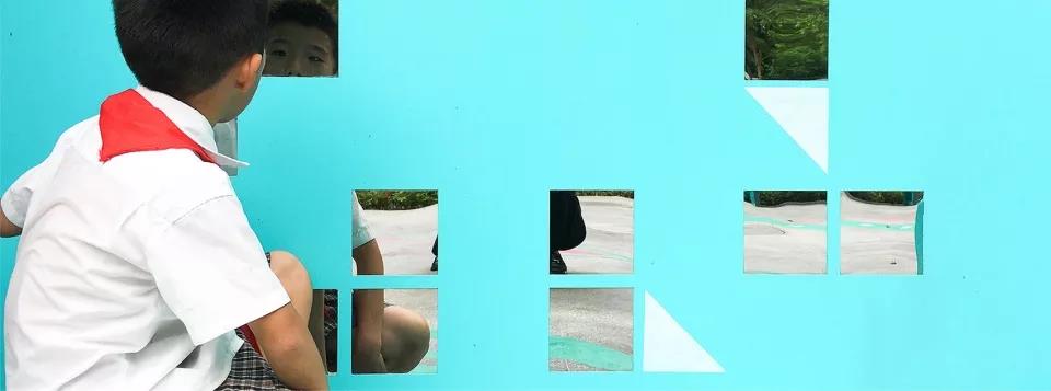 樹下秋千與座椅:圍墻背后有一顆多年生長的橡膠榕,大樹為場地提供庇護與遮陰,但大樹被隔壁地塊圍墻所隔離,失去完整的形象,把寫意化的樹干與落葉定格在墻框內,與背后現實的大樹形成對比,把現實不可觸碰的大樹變成可接觸的風景。
