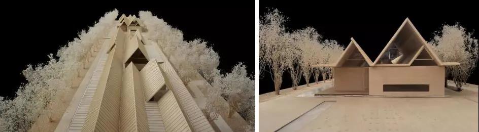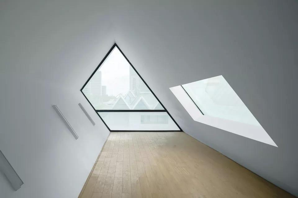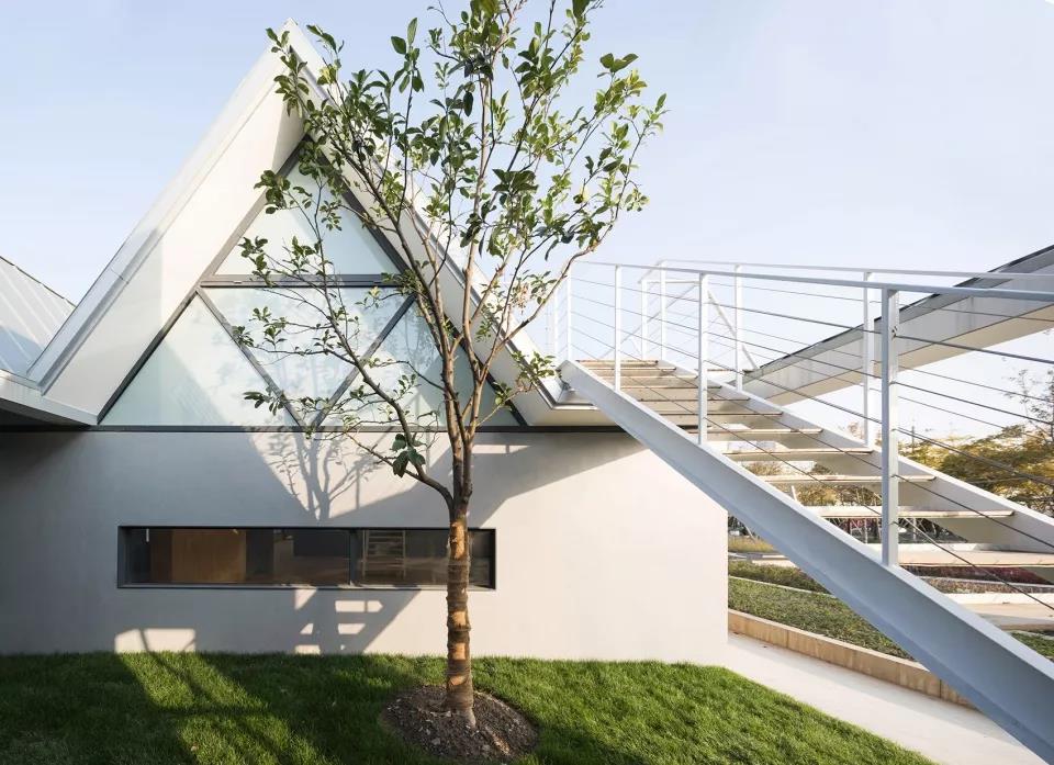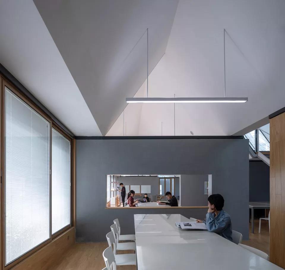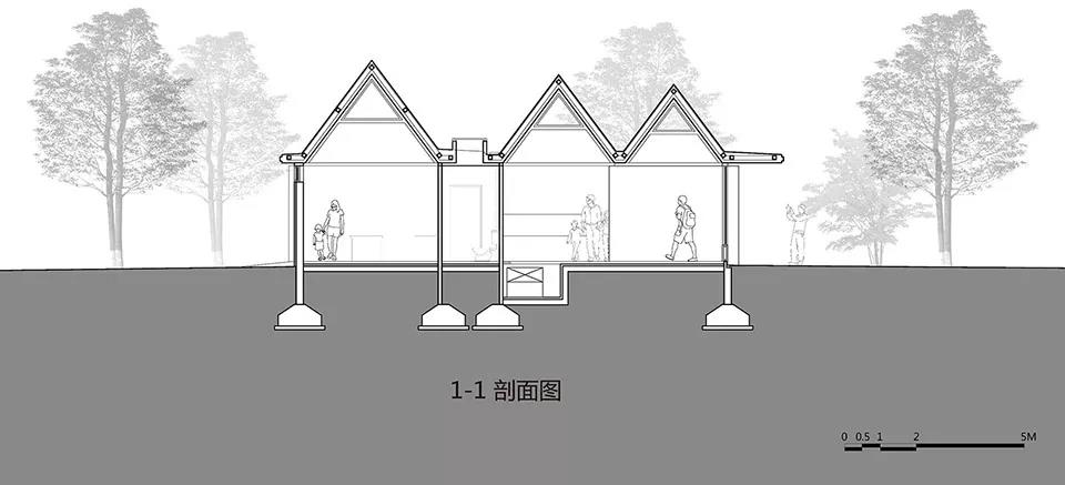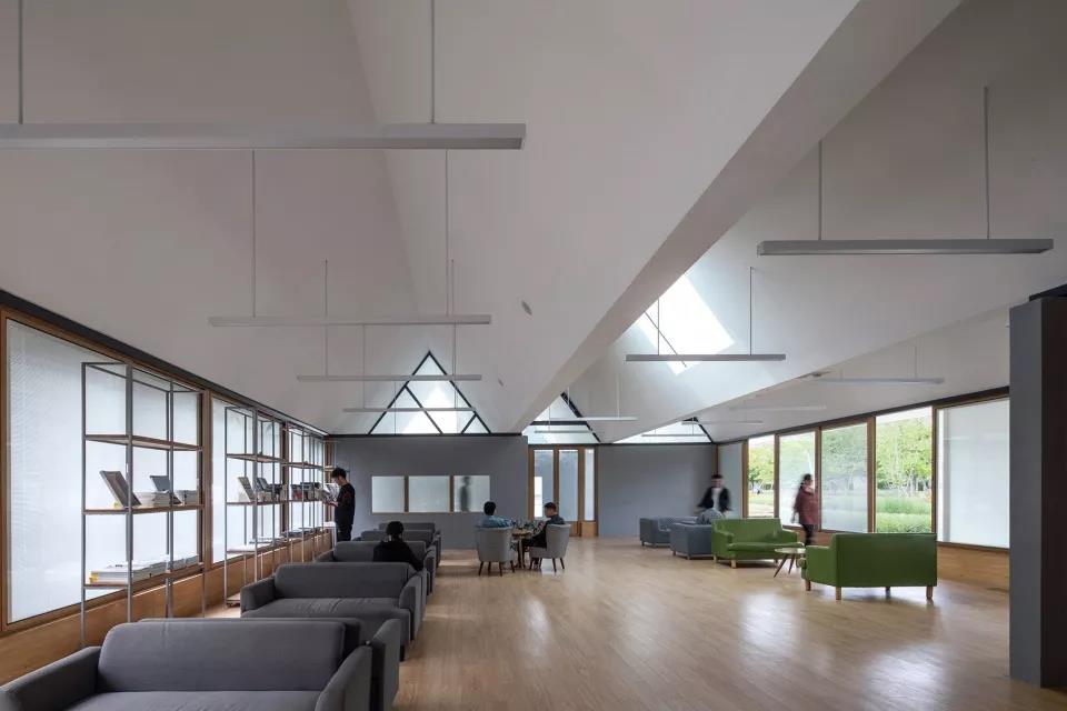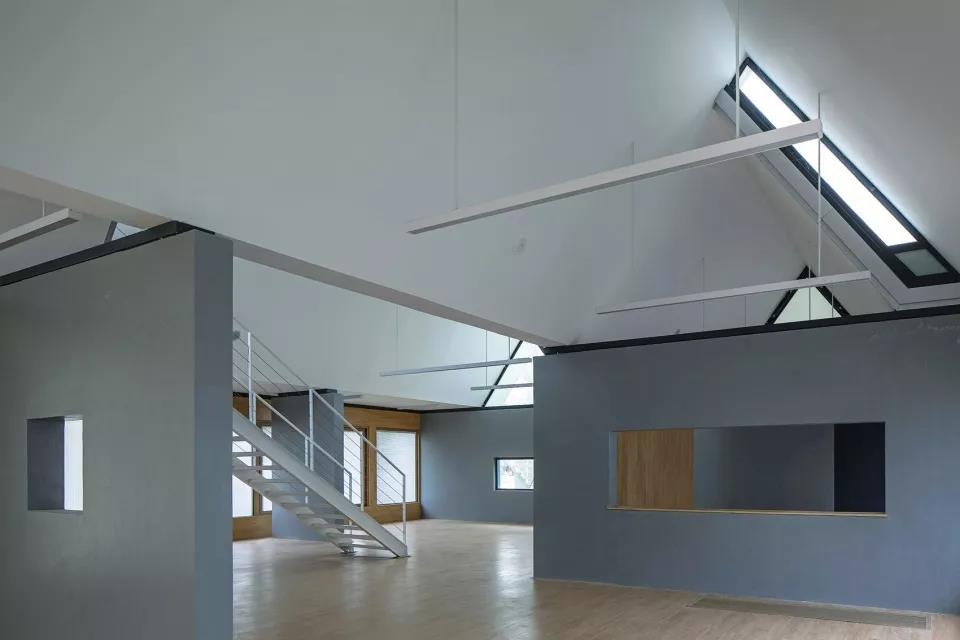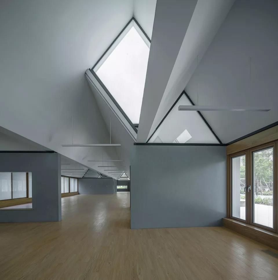 東西方向的混凝土墻采用的不是傳統山墻的形式,而是高度均為2.65米的水平片墻,這樣可以在坡屋頂和混凝土墻之間形成大小不一的三角形高側窗,為室內空間創造不同的明暗氛圍。而折板屋面輕輕放置在混凝土墻上的受力特征,也在“山墻”面上直接體現出來。