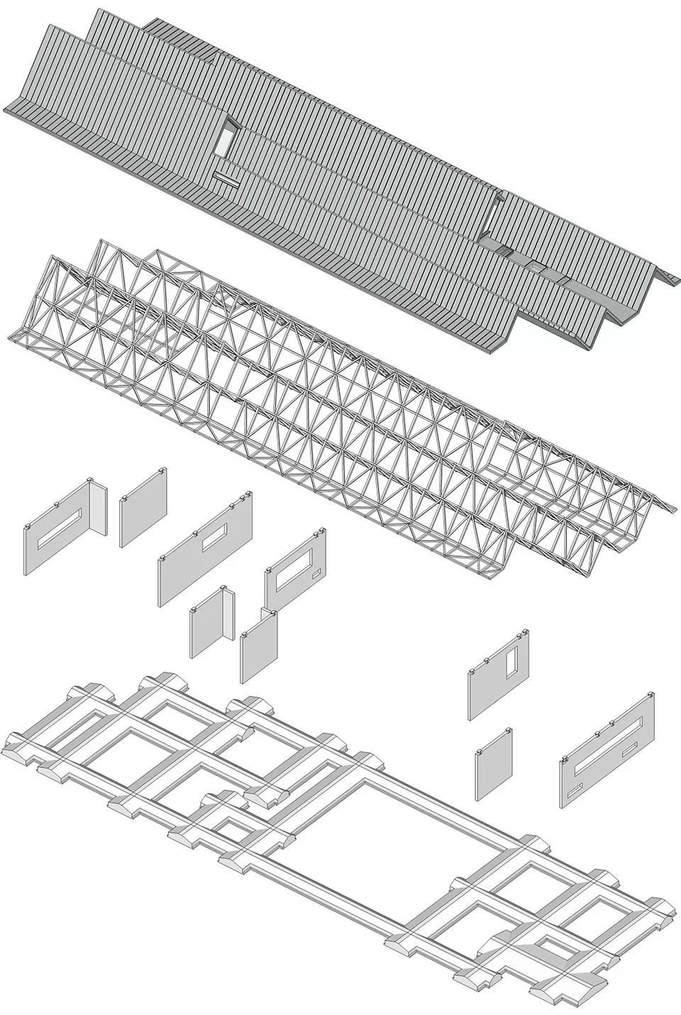 兩道山墻支撐一個坡屋面可以認為是傳統家屋的基本原型,那么用四道混凝土墻支撐的兩折屋面,則是本項目“家的延伸”的基本演繹。多道混凝土墻更加靈活的組織,支撐上部多折的屋面,以及縱向上的不斷延伸,形成活動之家空間結構的基本邏輯。
