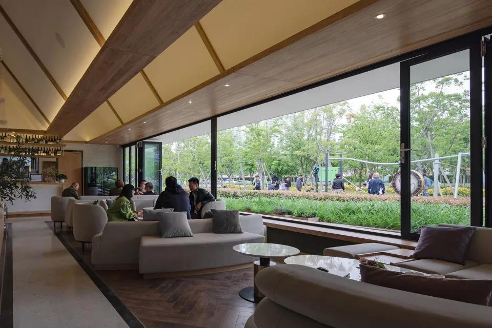法南餐廳將下沉屋和小閣樓單獨劃出來作為辦公空間,北側擴大為備餐間,中部作為自由的就餐空間,餐廳更將面向兒童樂園的窗戶修改為推拉折疊窗,讓窗戶可以完全打開,建立了內外交融的景觀對話。