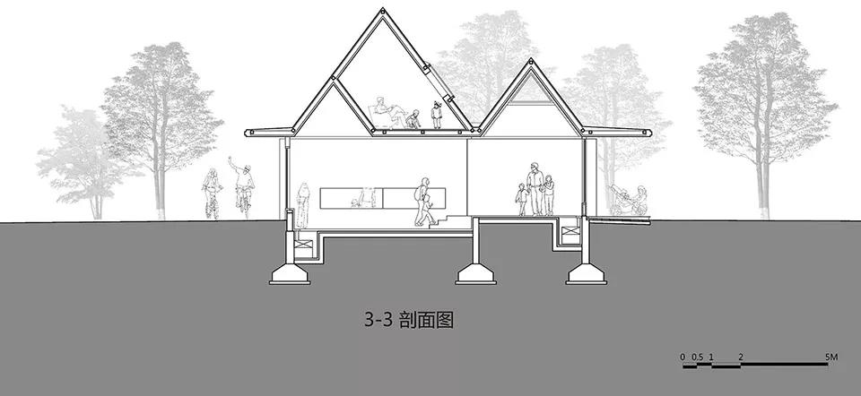 這樣,自由分布的混凝土墻支撐起一個雙坡屋頂的集群,大小屋面交錯嵌套,生成了高低起伏、櫛次鱗比的形態,如同一個聚合的小村莊。整個建筑在橫向剖面上的近人尺度源于對傳統居住空間的日常體驗。