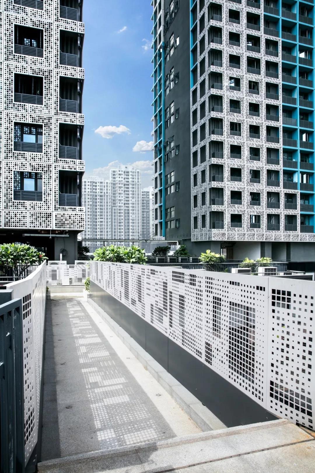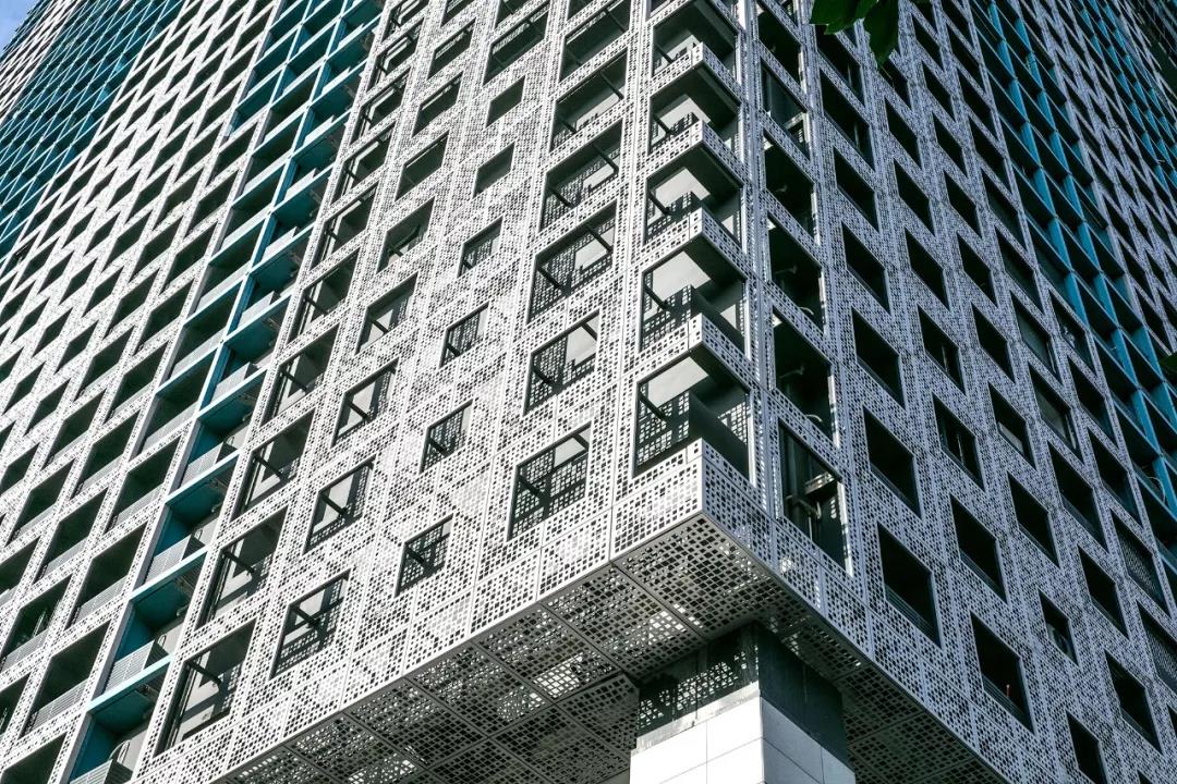 十八樓與十九樓是空中花園與走廊,在高空把兩棟樓連接在一起,讓人們在不同城市標高上享受豐富的空間樂趣。在立面設計上我們以樹影為靈感設計了以自然二維碼為主題的建筑外表立面,用沖孔鋁板幕墻給建筑附上一層通透的表皮使之起到環保、生態、遮陽的效果。而不同的洞口變化韻律使堅硬冰冷的建筑附上了一層溫柔與綠意。
