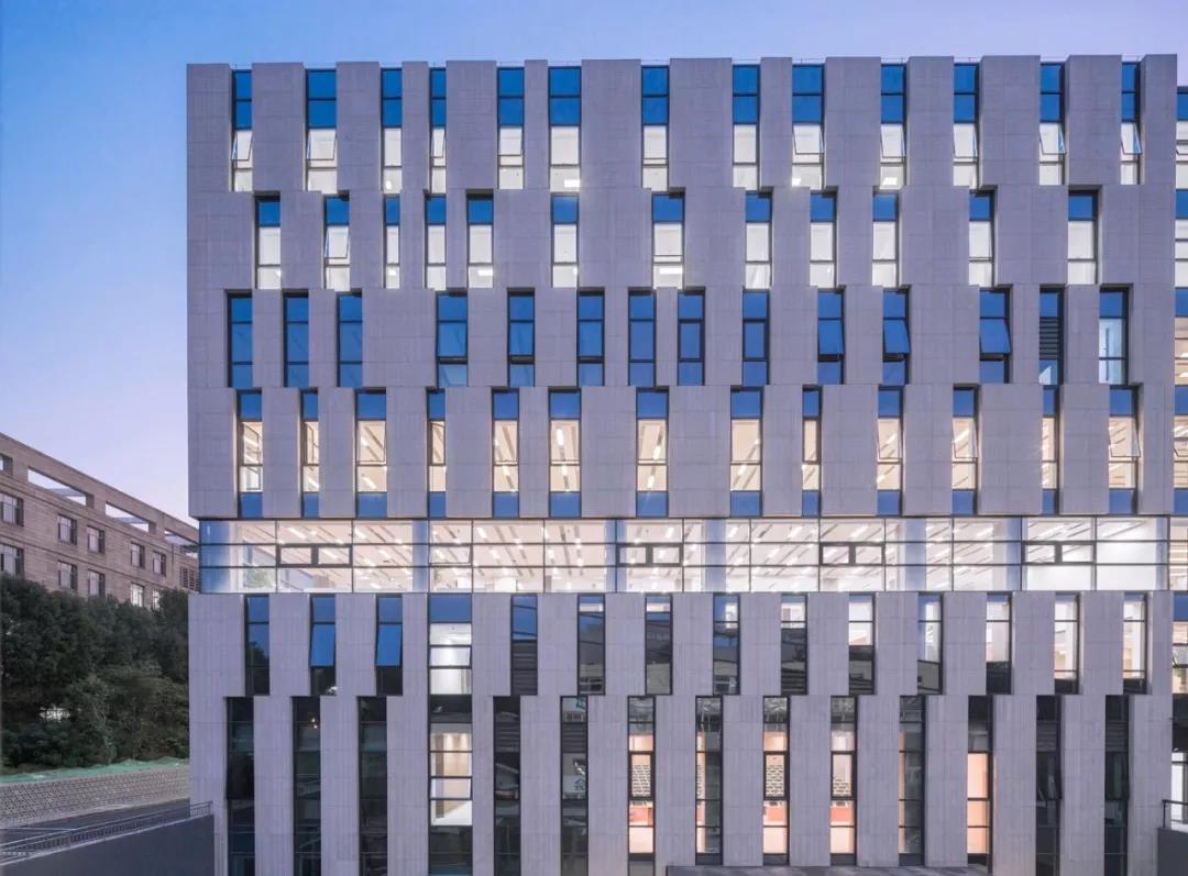 建筑內部的挑空的空間主題在室外依然有延續。更為特別的是,閱覽和研究區旁連續的一扇扇窗呈錐形對角狀,為建筑中部三層增添了透明的質感,效果十分靈動。而外立面的石材覆層呈垂直條狀,仿佛是中國經典的竹卷書簡。設計與空間的功能相契合,建筑整體會令人聯想到傳統的雕版印刷和印章,這些與書籍、秩序和法律緊密相連的形象。