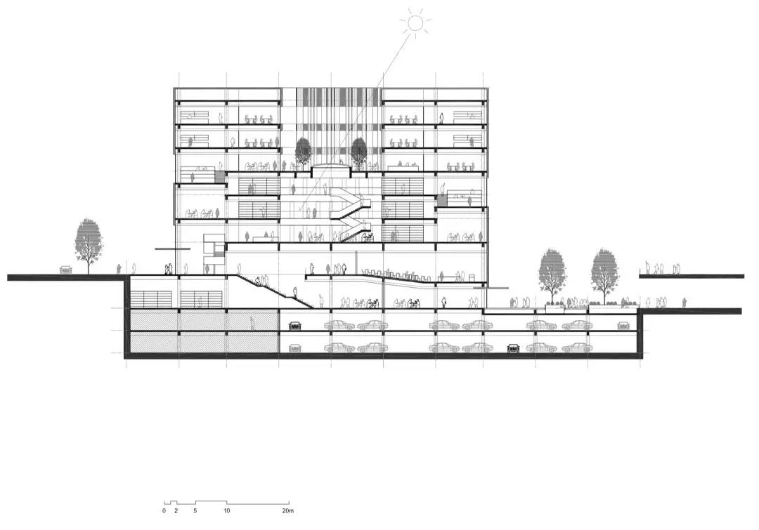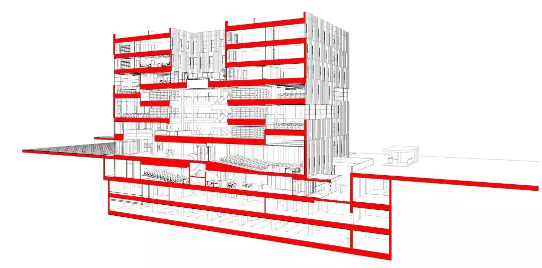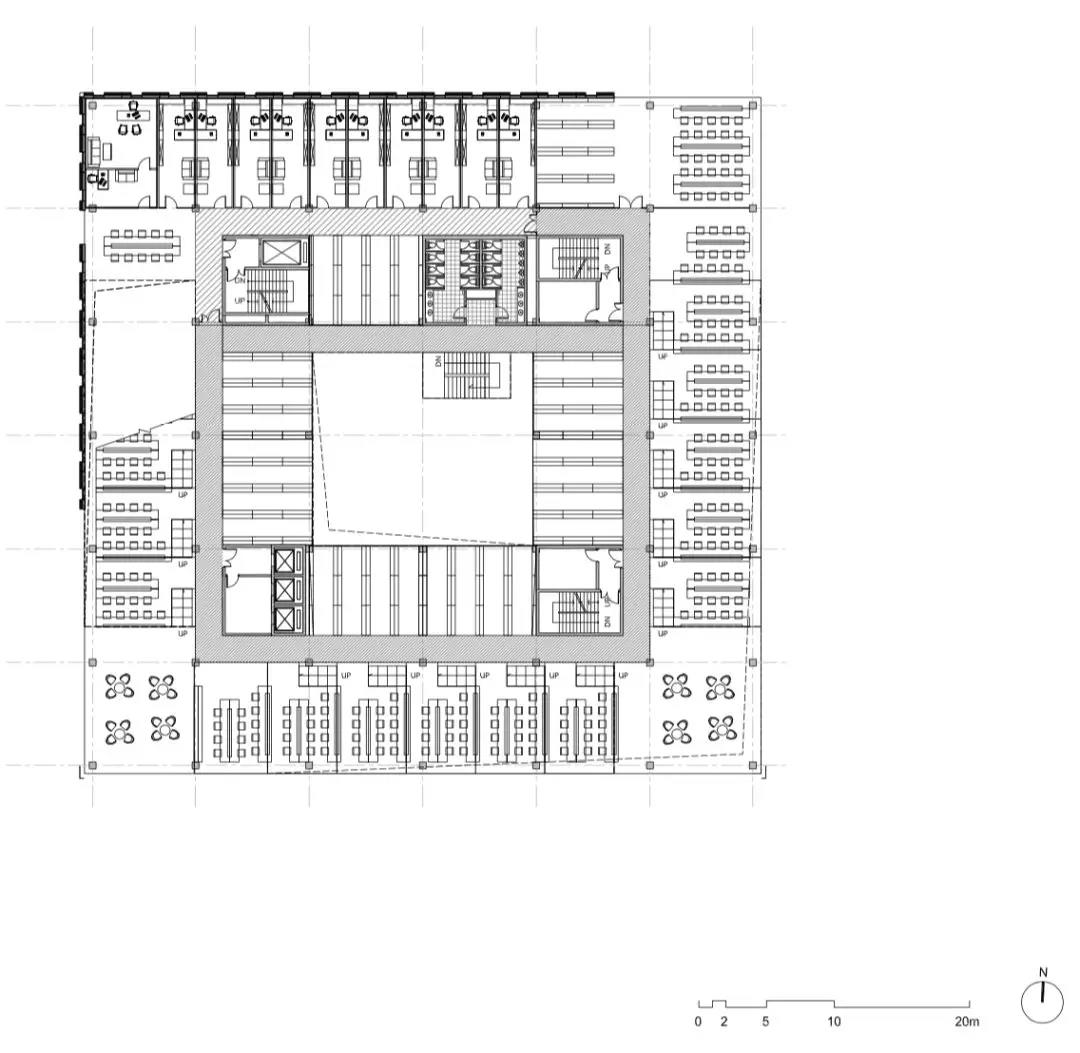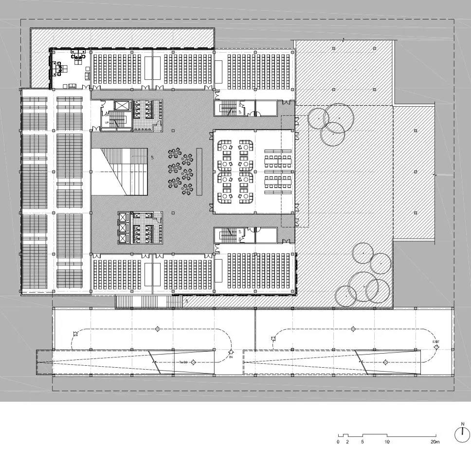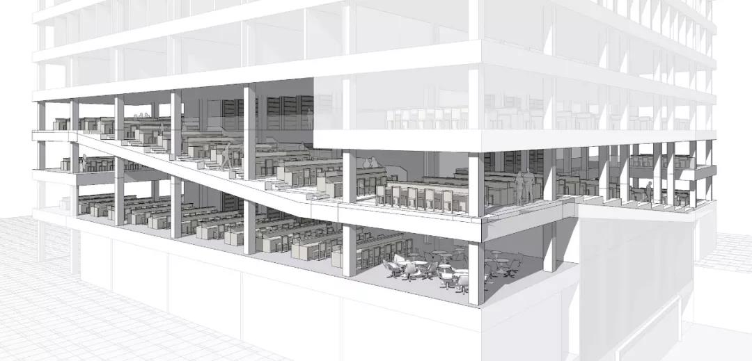 建筑功能垂直劃分,低區主要作為開放的公共空間,向上則偏向封閉的私密空間。為與周邊的露臺及分區景觀相協調,圖書館的兩個入口被分置于不同的樓層。西側的入口設在地面首層,并通向一個兩層通高的中庭,空間開敞且通風極好,并與一個約450坐席的活動空間相連,主要用作模擬法庭;東側的入口則設在地下,通往學生中心、自助餐廳及多媒體教室。