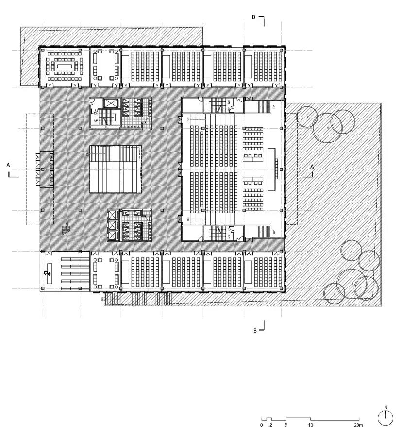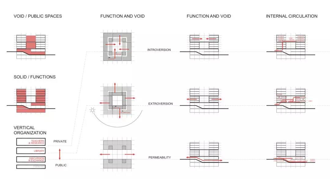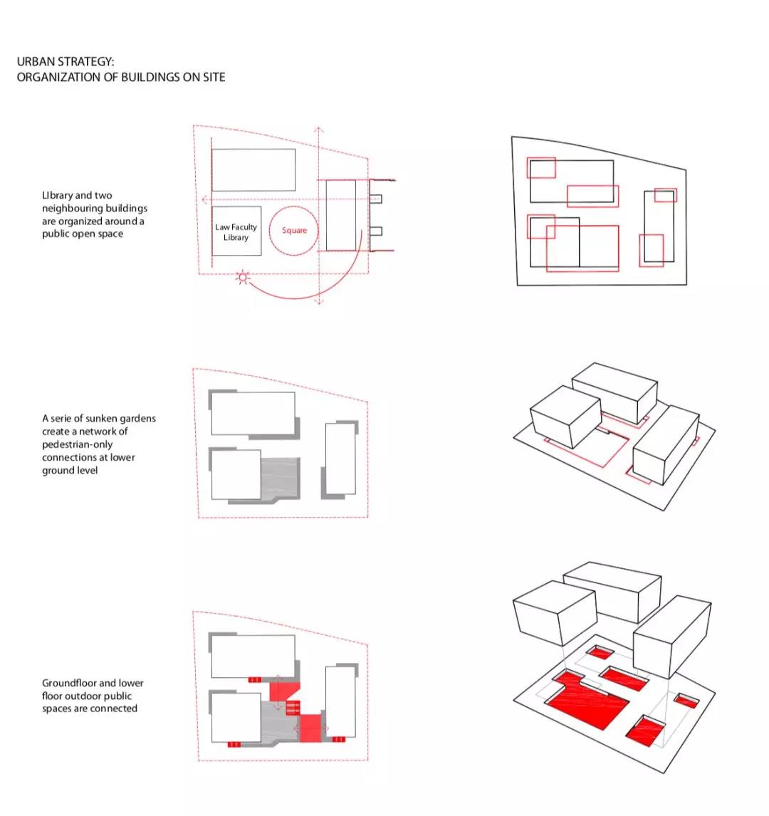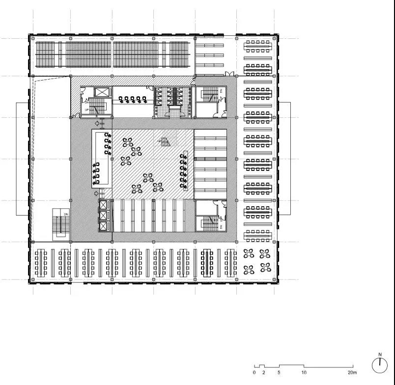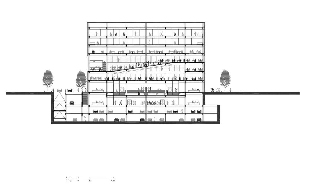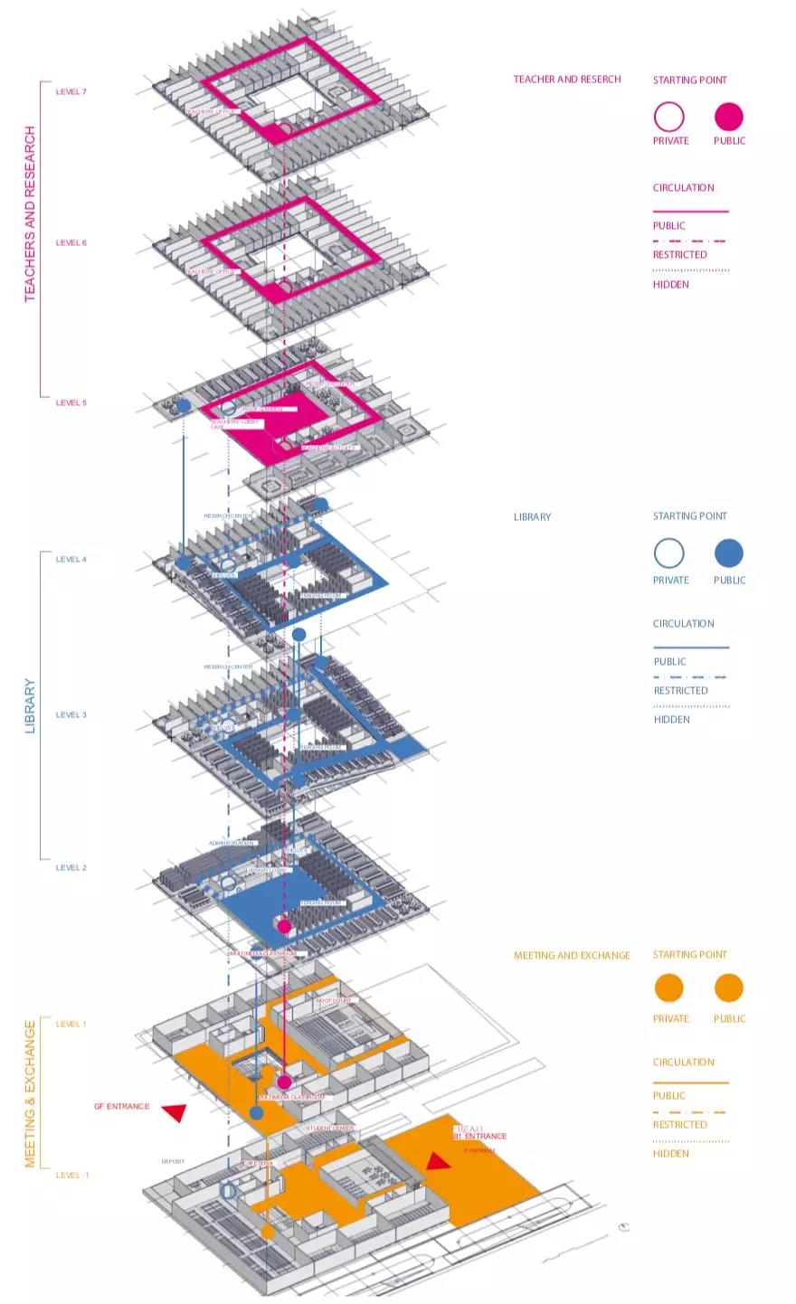建筑功能垂直劃分,低區主要作為開放的公共空間,向上則偏向封閉的私密空間。為與周邊的露臺及分區景觀相協調,圖書館的兩個入口被分置于不同的樓層。西側的入口設在地面首層,并通向一個兩層通高的中庭,空間開敞且通風極好,并與一個約450坐席的活動空間相連,主要用作模擬法庭;東側的入口則設在地下,通往學生中心、自助餐廳及多媒體教室。