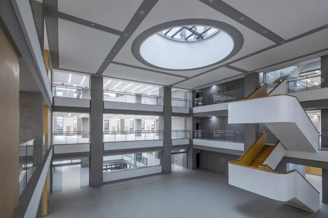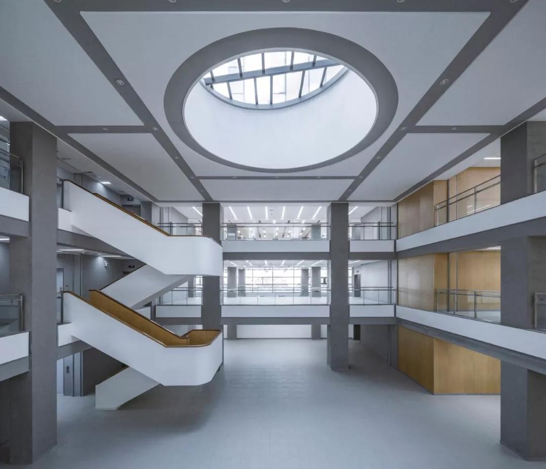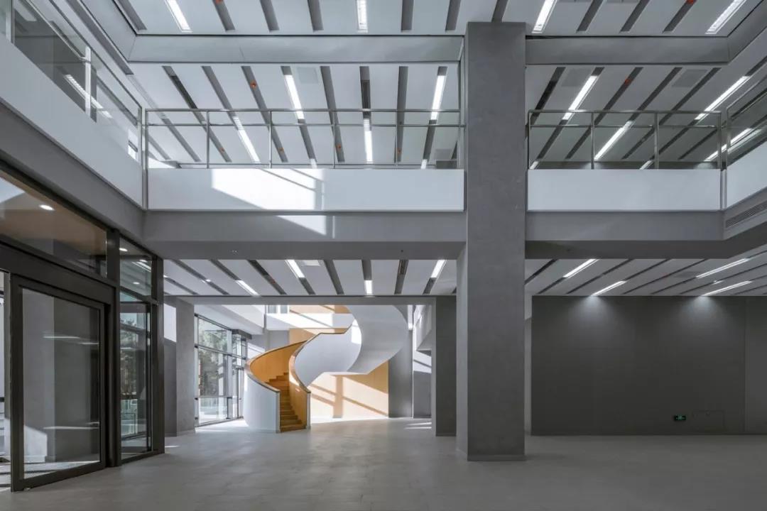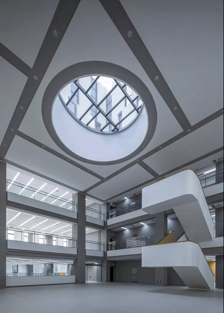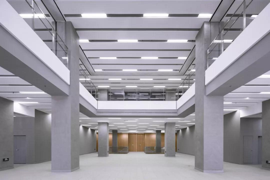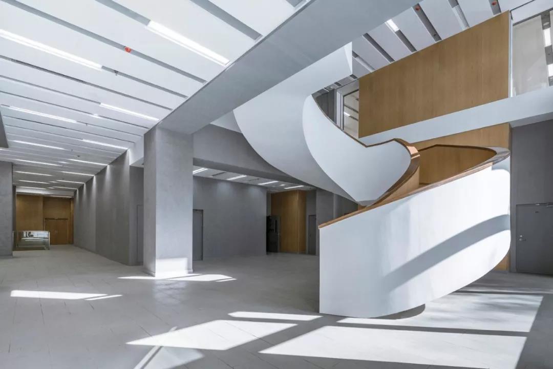 再往上走,最上面的三層是學術人員的辦公室和研討室。與下方樓層的開放性形成鮮明對比的是,尺度收窄的入口區平和安靜,向內的區域幾乎像修道院回廊一般私密。這里同樣延續了空間的虛實相生和挑空的主題,設計受中國古典園林的藝術啟發,樓層的平面功能圍繞著中央庭院來布置。空間的中心點是天窗,設計通過光線含蓄地連接所有元素。