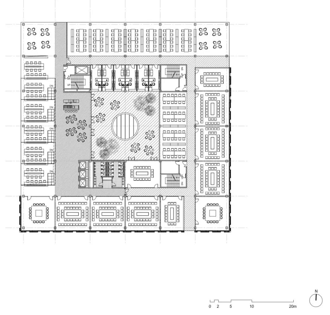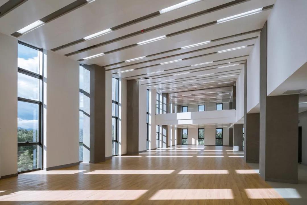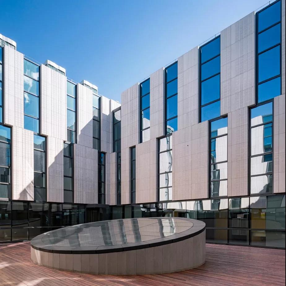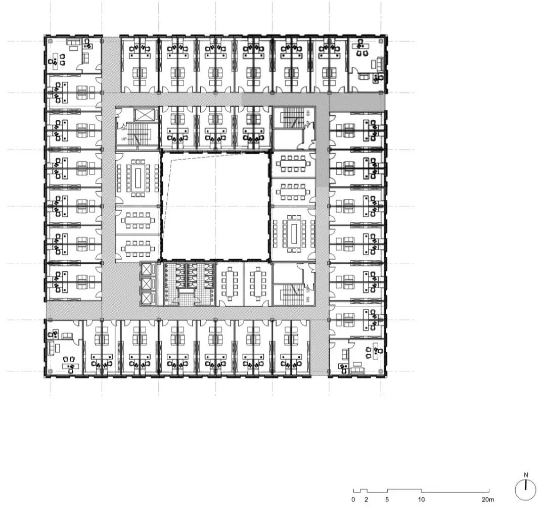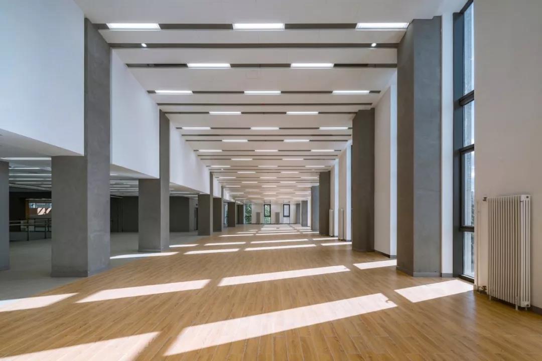 再往上走,最上面的三層是學術人員的辦公室和研討室。與下方樓層的開放性形成鮮明對比的是,尺度收窄的入口區平和安靜,向內的區域幾乎像修道院回廊一般私密。這里同樣延續了空間的虛實相生和挑空的主題,設計受中國古典園林的藝術啟發,樓層的平面功能圍繞著中央庭院來布置。空間的中心點是天窗,設計通過光線含蓄地連接所有元素。