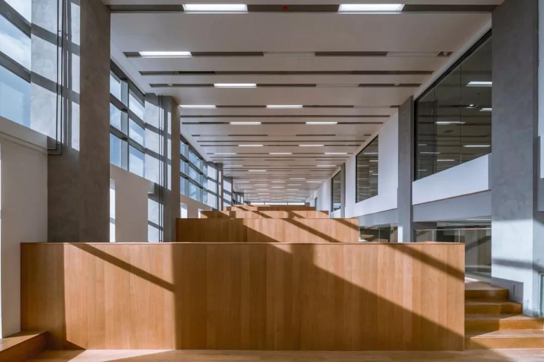 為創造更私密和安靜的環境,設計將三層以上的空間整體留給圖書館。中庭三層挑空,頂部天窗提供了充足的自然采光,圍繞這一中心,整體布局呈旋轉對稱狀展開:書架區在四周排列,外沿則是閱讀和學習區。由一系列的寬大坡道和階梯式座位區連接,配以淺色的木材,課桌被安置在落地窗邊,提供自然光的同時也為使用者提供了舒緩、平靜的閱讀體驗。設計不僅創造了一個可高效利用的空間,更可以讓師生和訪客在其中自由無拘、連續穿行。