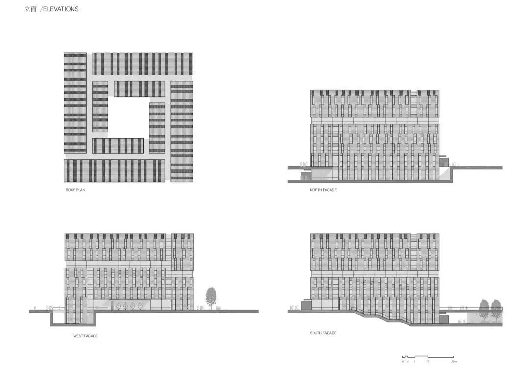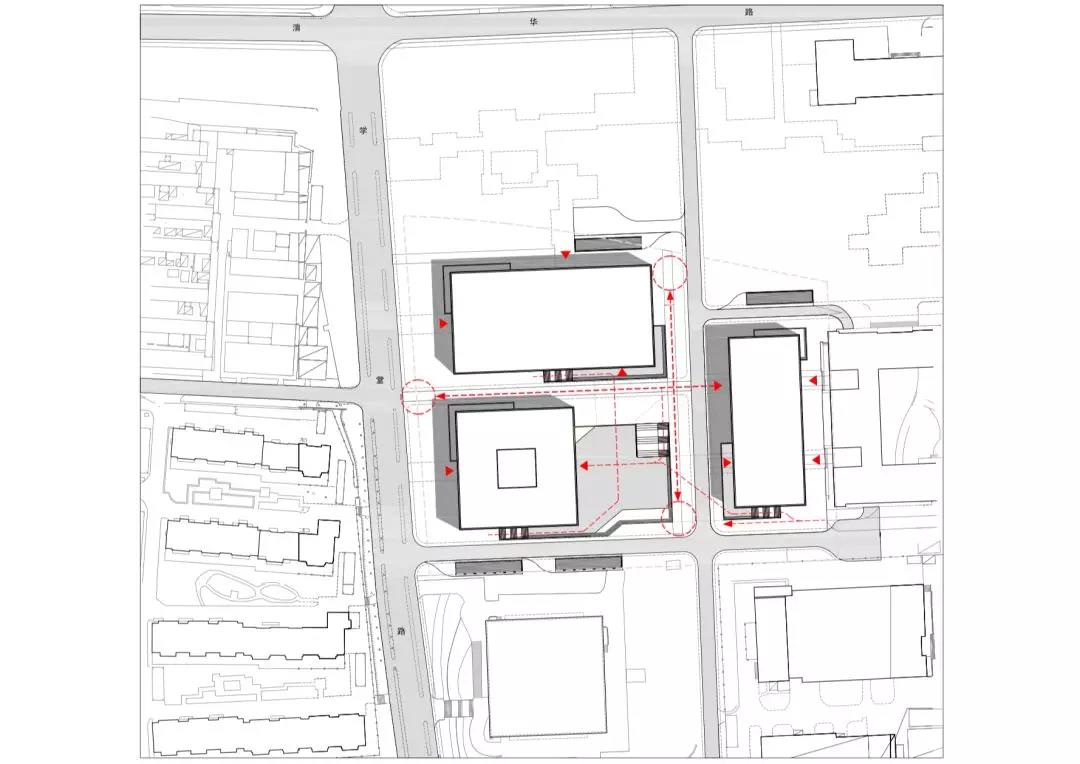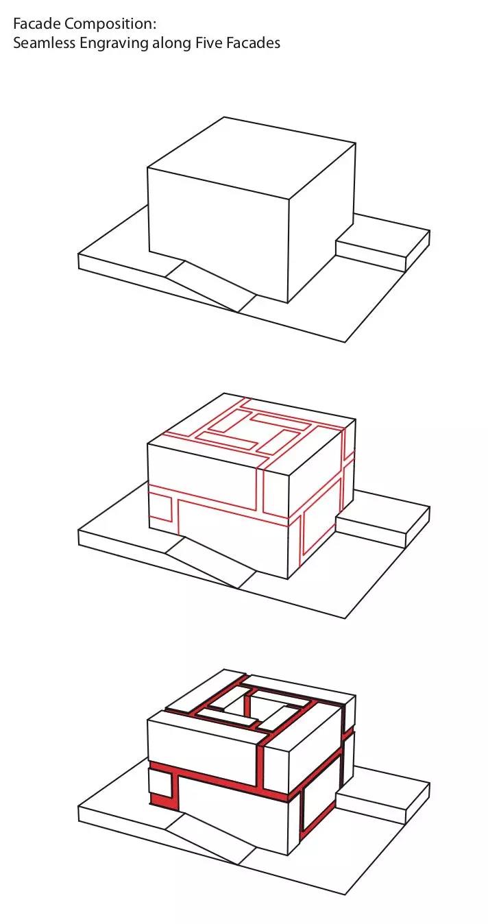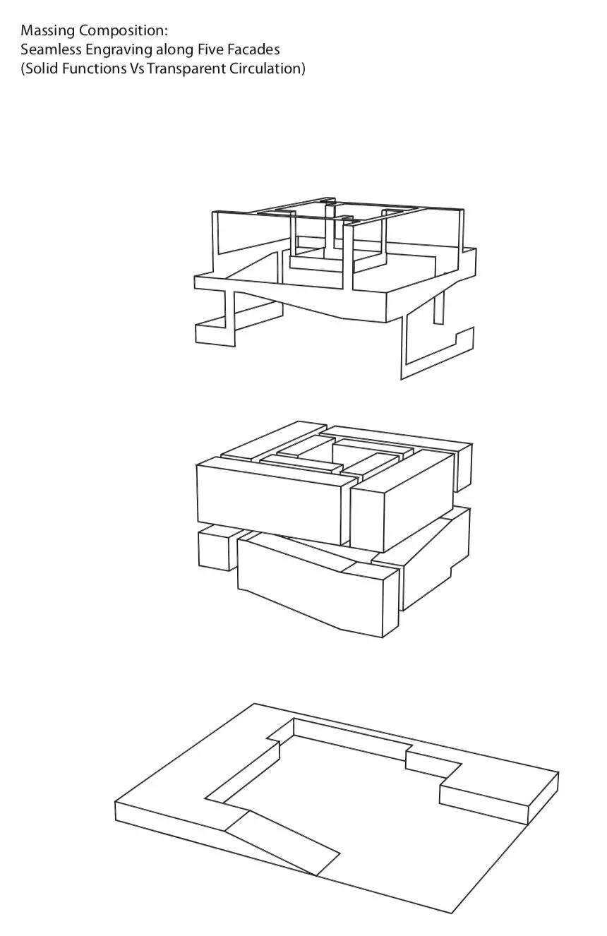 建筑周邊的空間虛實相映,讓人聯想到北京迷宮般的胡同,特別是那些掩藏在墻和門之后的傳統庭院。鏤空的空間也呼應著下沉天井這一主題,而天井正是周邊建筑的特色。