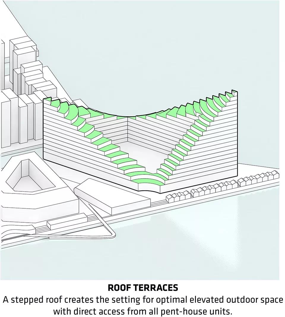 ▼寬敞的屋頂平臺、連續的陽臺、綠色庭院以及視野極佳的公寓共同創造出理想的生活模式,同時為港口和城市的天際線增添了活力