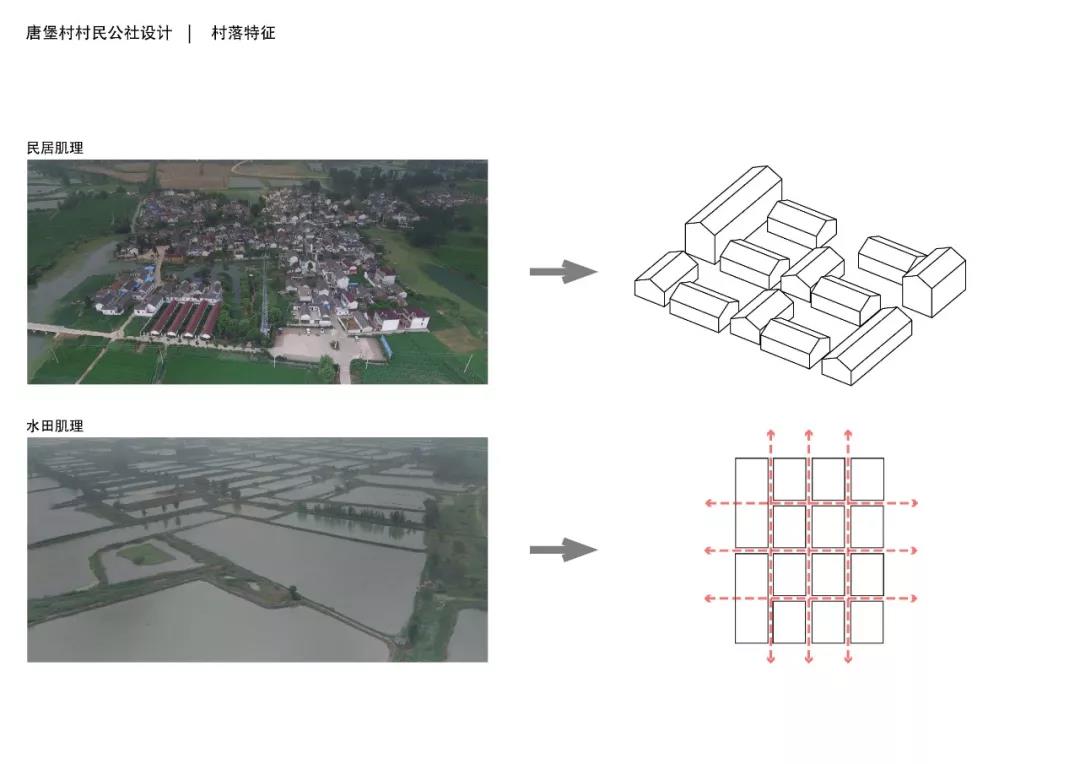 設計師為重新詮釋這一中國田園山水畫般詩意的訴求,實現讓建筑真正意義上的融入自然,保持村莊特有標志與肌理,將唐堡村內“村落”與“水田”兩種物質空間形態被提煉、置入到村民生活之中。