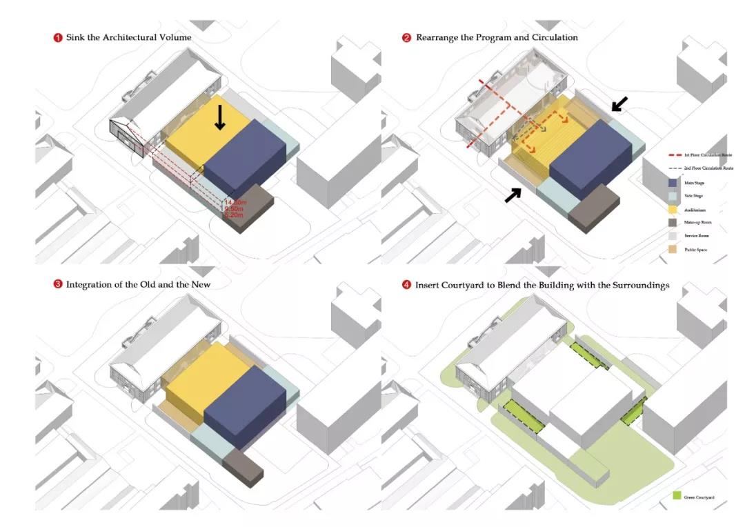 功能布局突破劇場前廳,觀眾廳,舞臺區,分區過于明確的功能擺布方式,結合空間訴求,通過對新老建筑的連接和梳理,在建筑的底層及二層將不同形式的演出集會空間、公共展示空間、休憩交流空間功能充分融合,形成高效關聯,公共開放的復合功能綜合體。