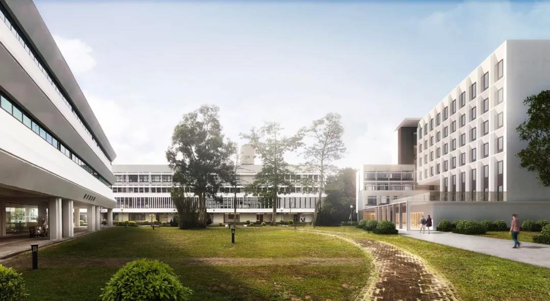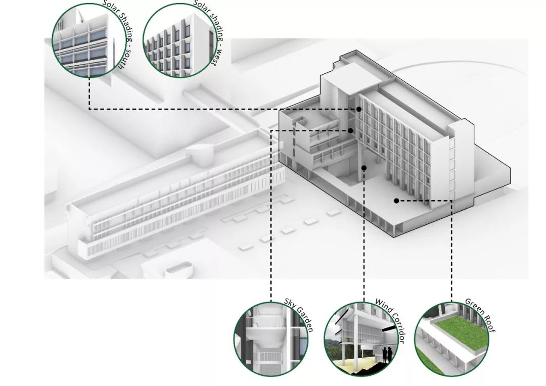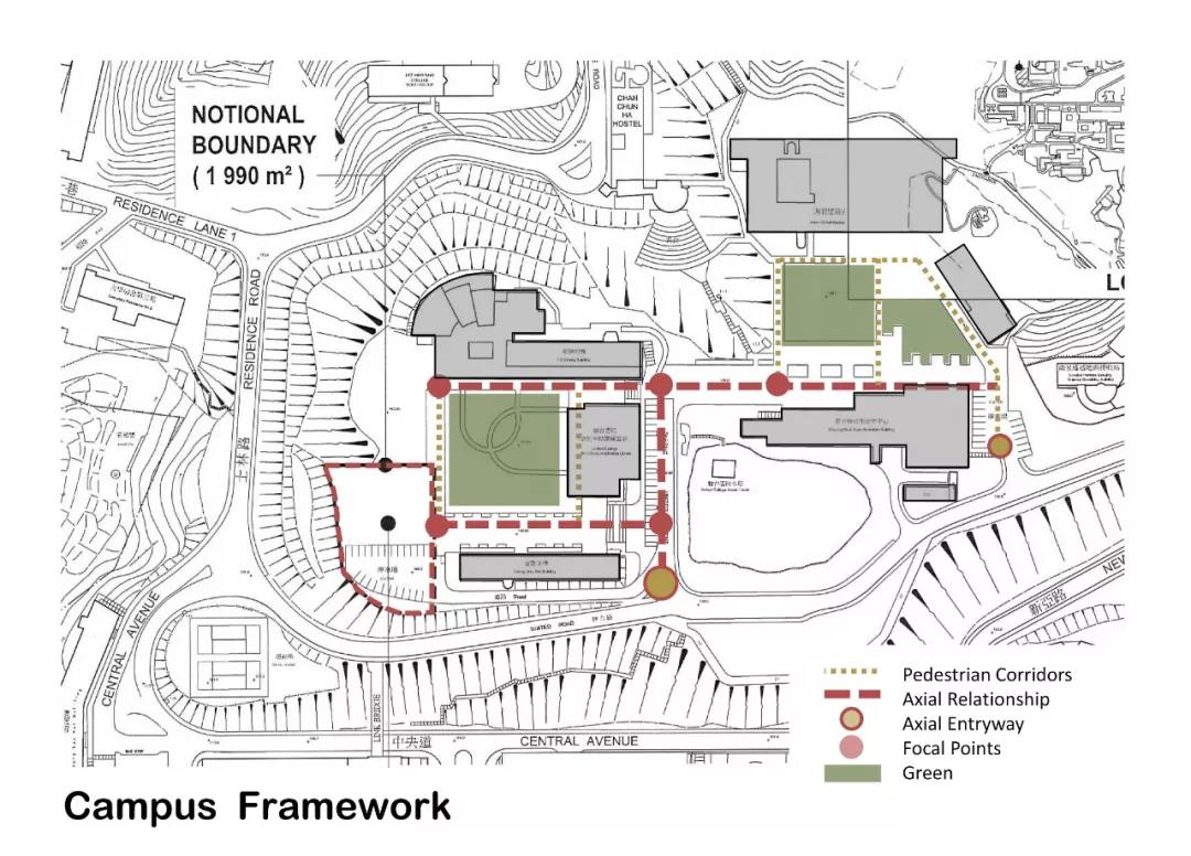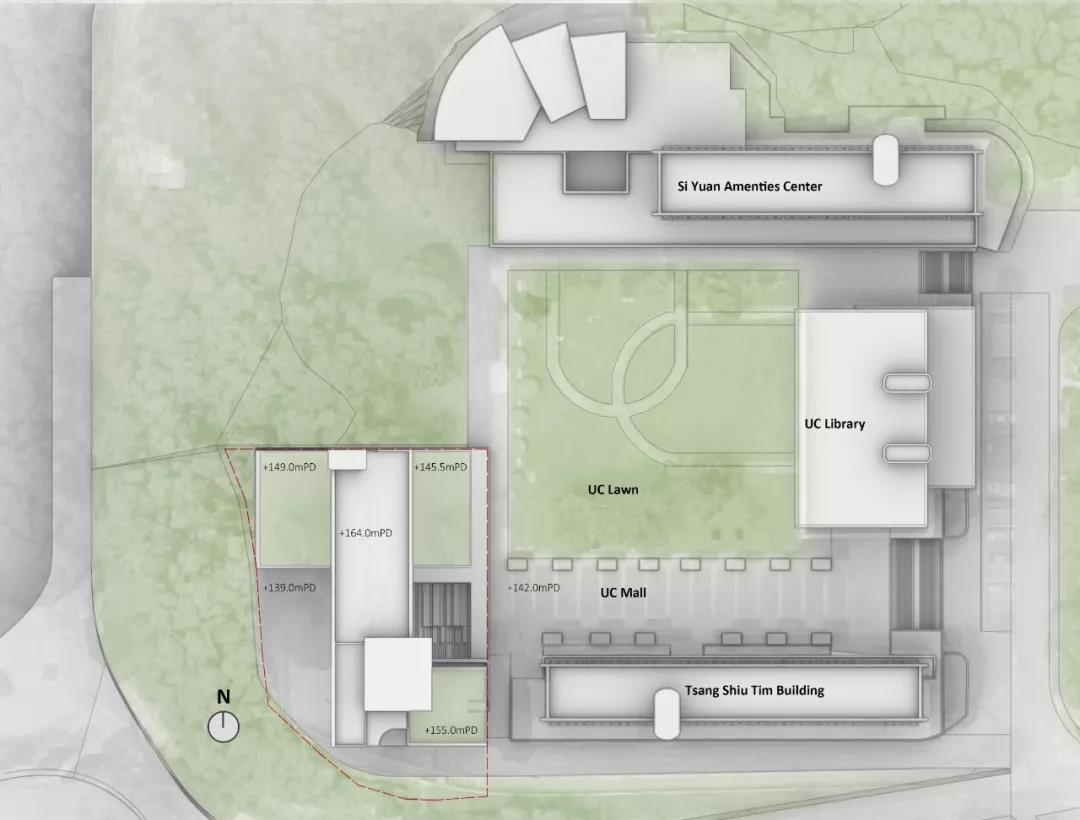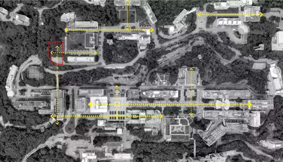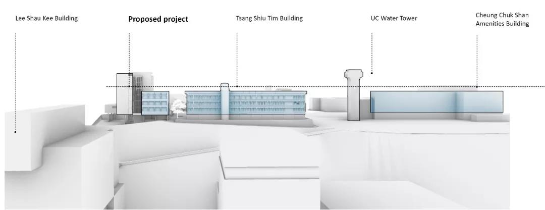 作為現有建筑集群的延伸,新建宿舍樓通過打破南翼和西翼的體量,在與曾肇添樓建筑高度保持一致的同時順沿聯合書院大道軸線,創造出一個面向遠處的框架景觀。整個建筑不僅從校園中心的角度創造了水平體量的連續性,還與聯合書院建筑群形成一個連貫的天際線和友好的城市建筑界面。