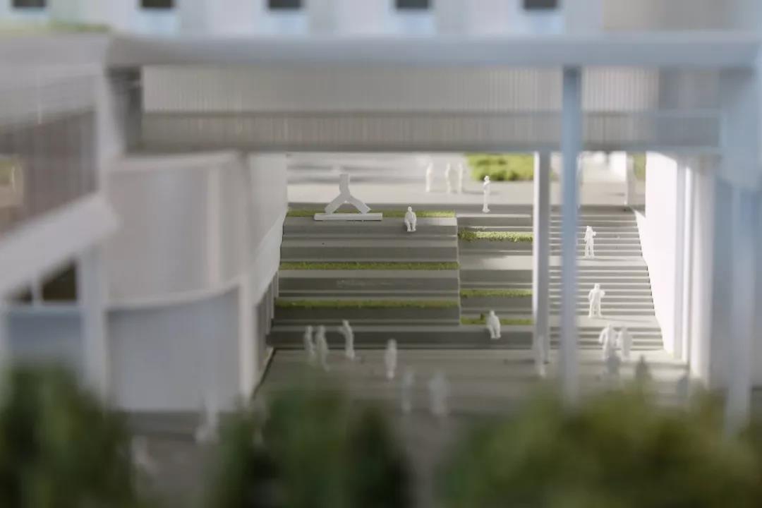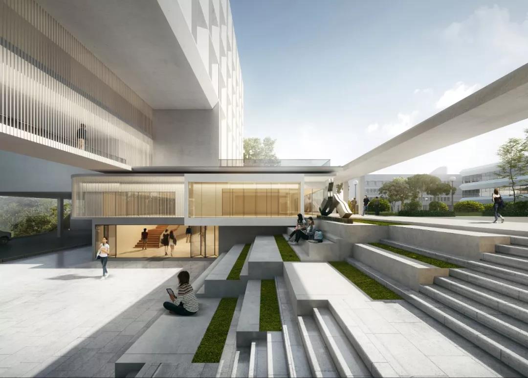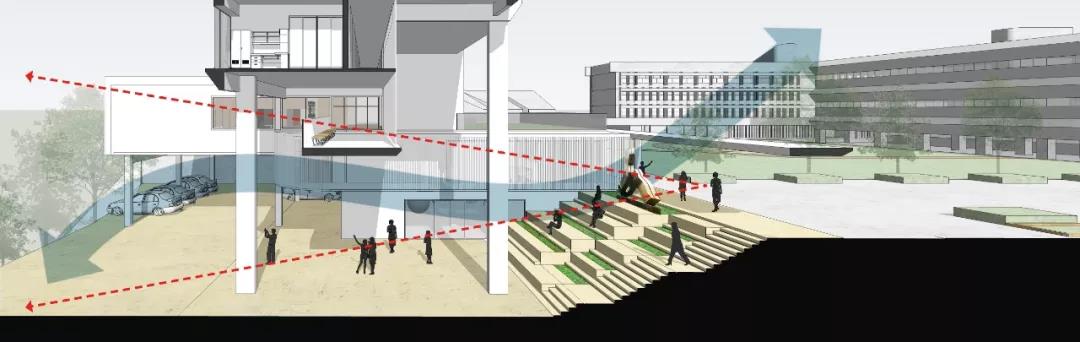 通過藝術雕塑穿插其中的有遮蔽的下沉景觀庭院,作為校區新的公共樞紐位于聯合書院大道軸線的末端,在這個自然流通且無能源設備損耗的風廊場所,師生們可在景觀與建筑之間毫無阻礙的出入,進行單純的放松、閱讀或各種簡單的主題文化社交活動。急車輛通道及泊車場則自然隱匿在建筑體塊背側較低的地面,在具備建筑入口廣場的功能的同時也減少了行車對聯合書院草地的干擾。