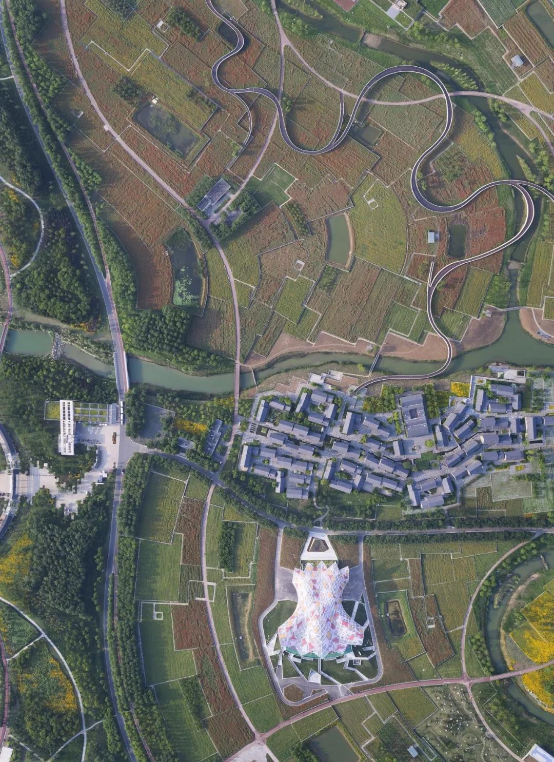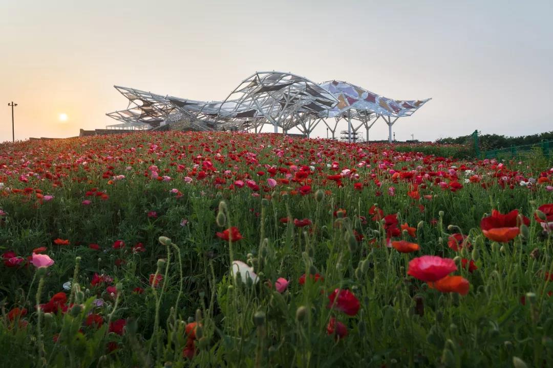宿遷三臺山森林公園花田劇場,一次大型景觀建筑的設計挑戰。通常景觀建筑多為小體量,掩映在景觀中。劇場容納3000座室外觀眾席,有可遮蔽的屋頂覆蓋,體量遠大于一般景觀建筑。劇場周圍綿延五公里三色花海,兩公里彩虹橋蜿蜒其間。劇場如何消解較大的體量,融入花海無盡延伸的背景是設計的難點。