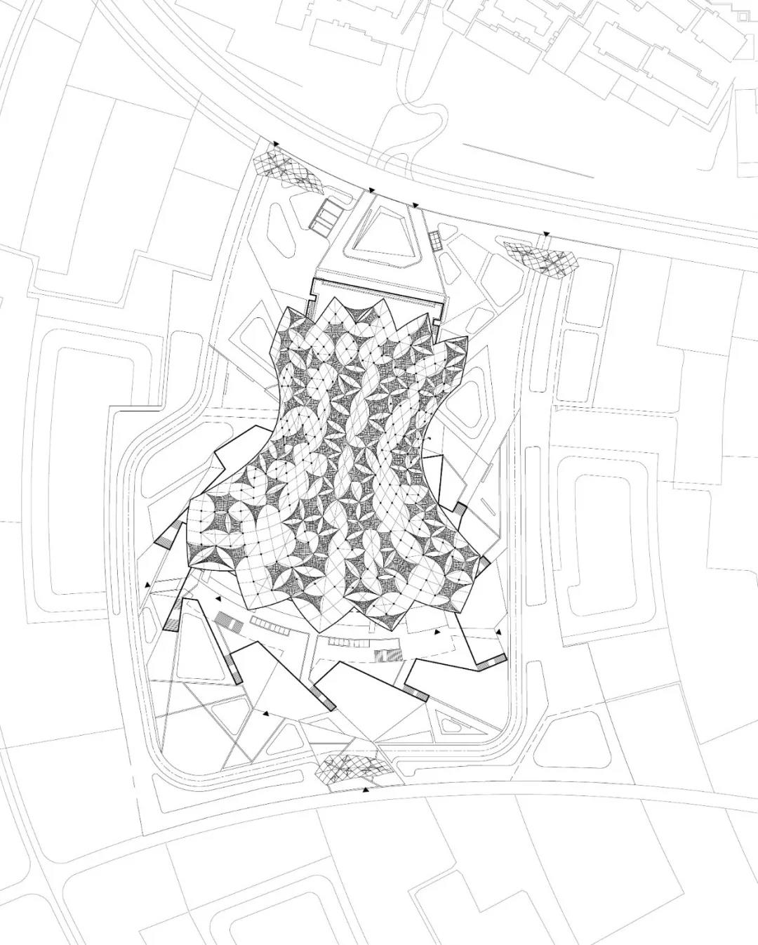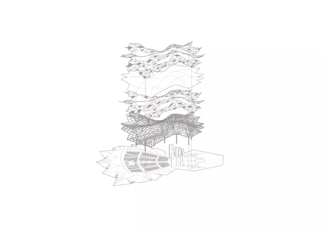 曾嘗試單元式的分散體量,雖然可以減少體量感,但又很難滿足劇場觀眾視線要求。最終采用自由曲面網架屋面加樹枝狀支撐結構的形式,暗合花朵和周邊樹林形態。